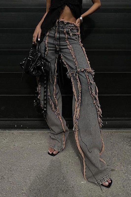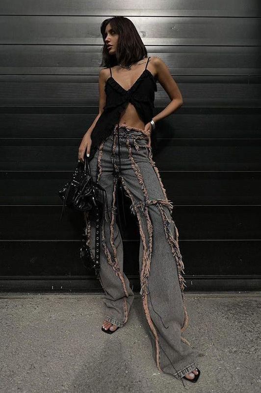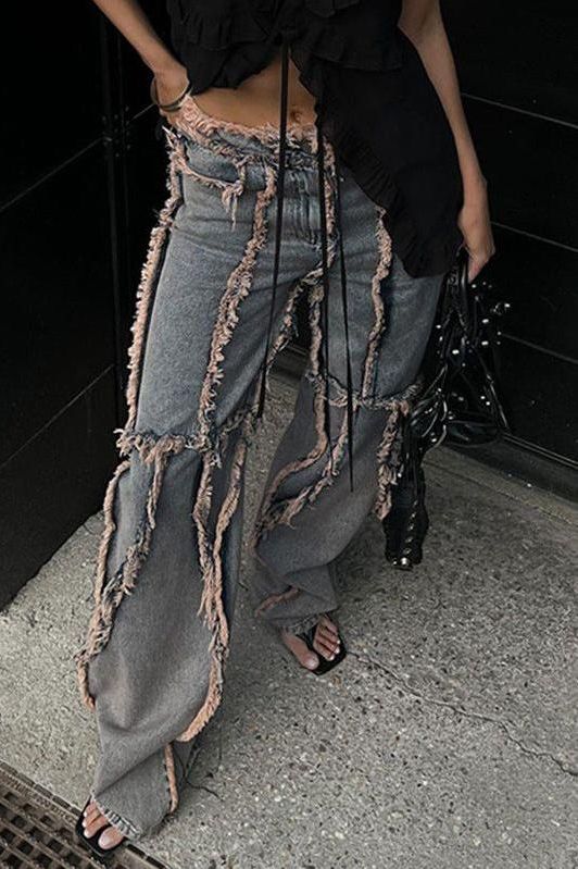 Discover the essence of American street style with our raw-edge split jeans. These jeans are not just a piece of clothing; they are a statement of individuality and bold fashion choices.