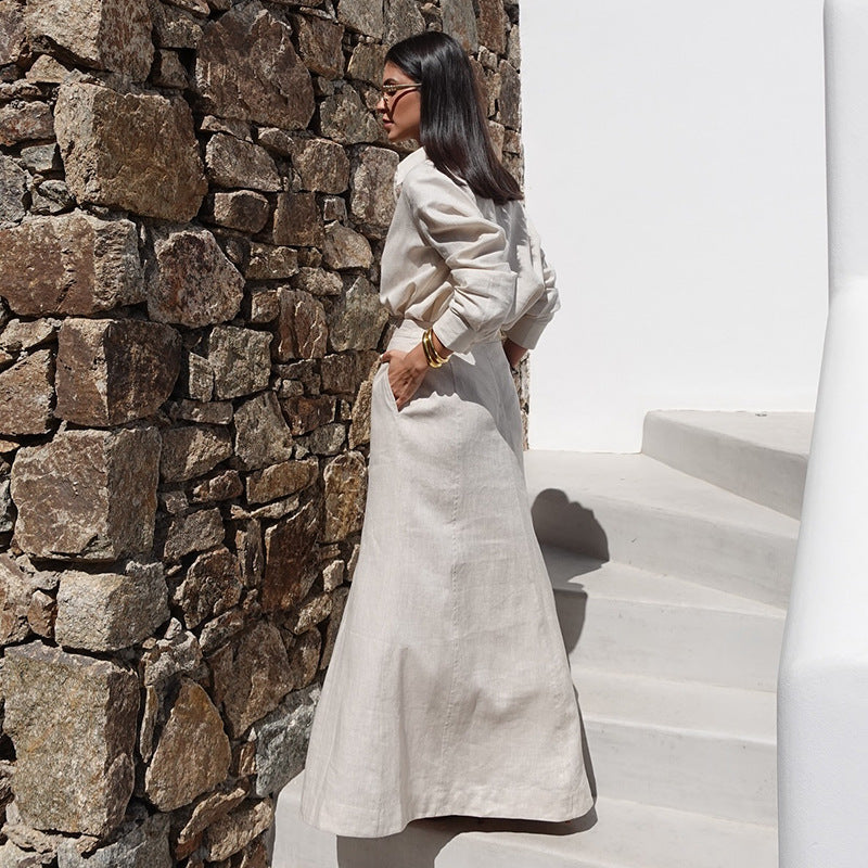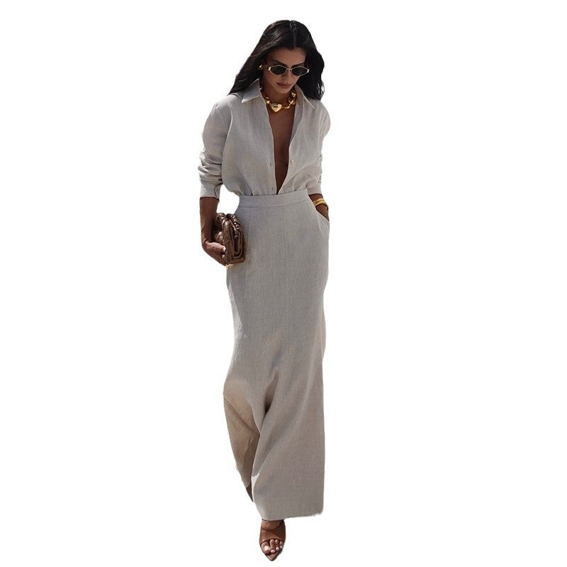 Discover the elegance of our Beige Two-Piece Skirt Suit with Plunge Blouse. a unique addition to your wardrobe. This ensemble seamlessly combines classic and contemporary styles. making it a standout choice for any occasion.