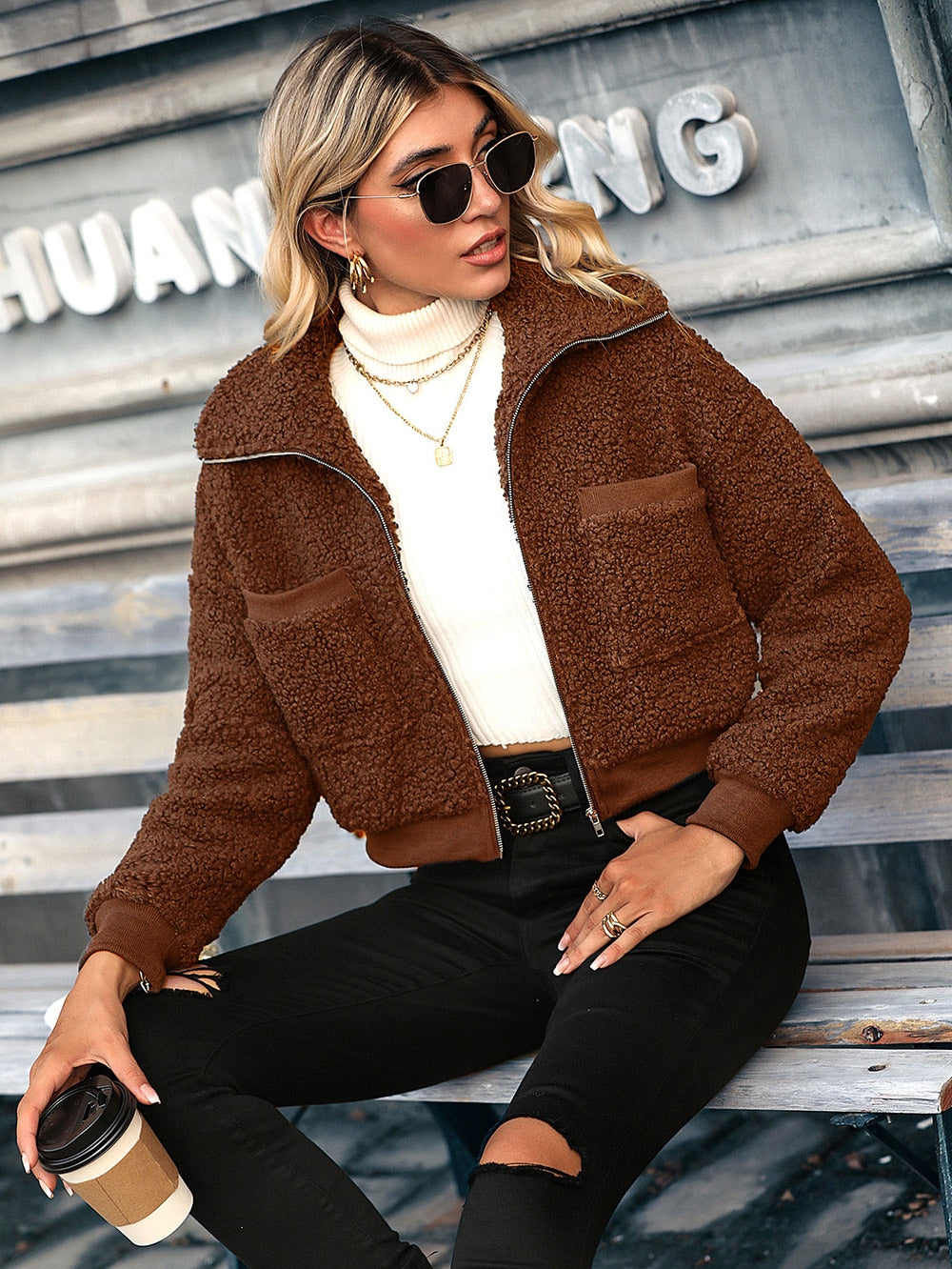 Jeebas - Drop Shoulder Solid Crop Teddy Jacket