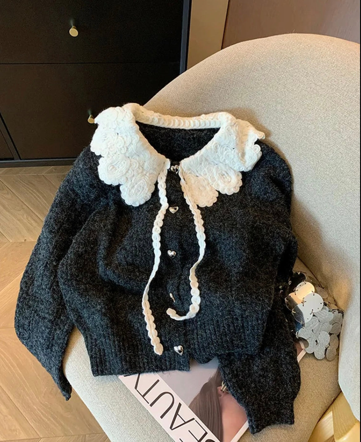Black Knit Peter Pan Collar Cardigan Details :