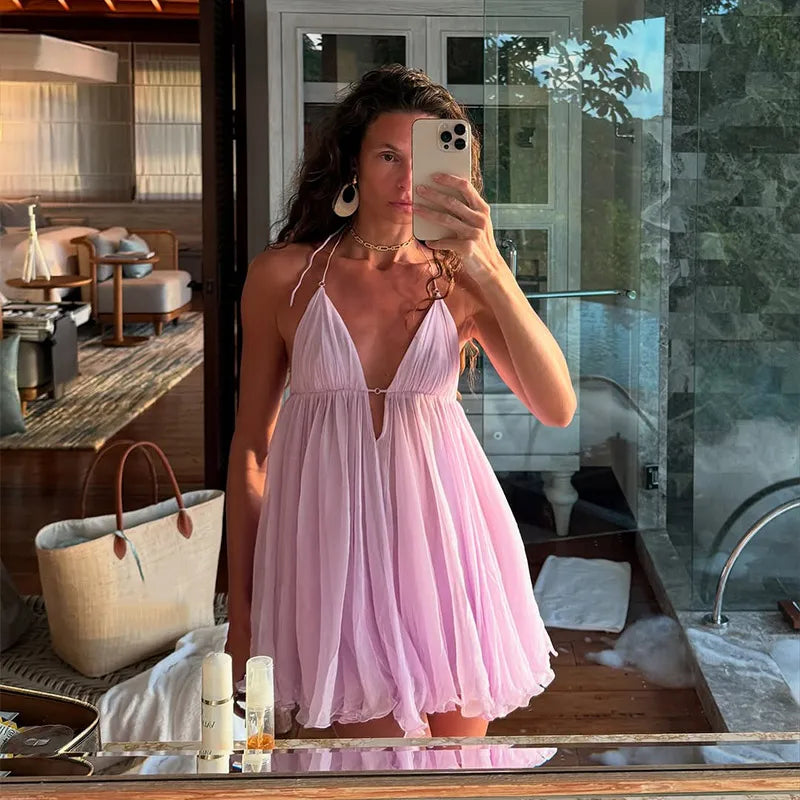 Product Description: Step out in effortless elegance with our Chiffon Strap Mini Flare Dress. a chic addition for any adult wardrobe. This lightweight dress features a flattering v-neckline and delicate straps. perfectly designed for warm weather. Its A-LINE silhouette and above-knee mini length create a playful yet sophisticated flared look. enhancing your natural shape with a slim fit.