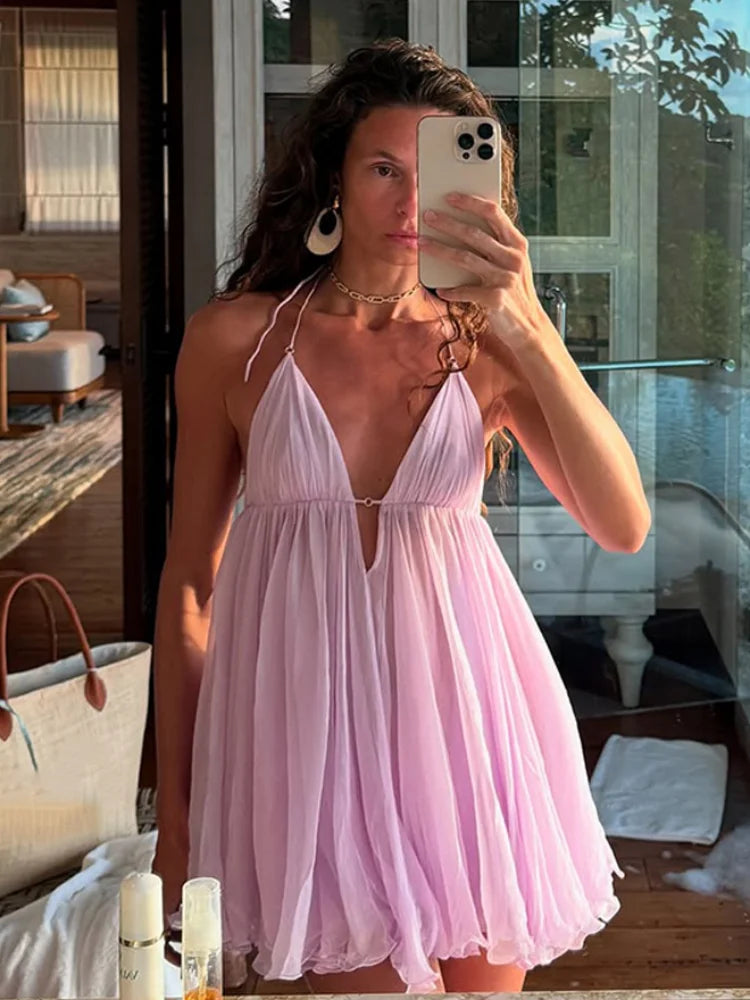 Optimized Product Title: Chiffon Strap Mini Flare Dress - V-Neck A-Line