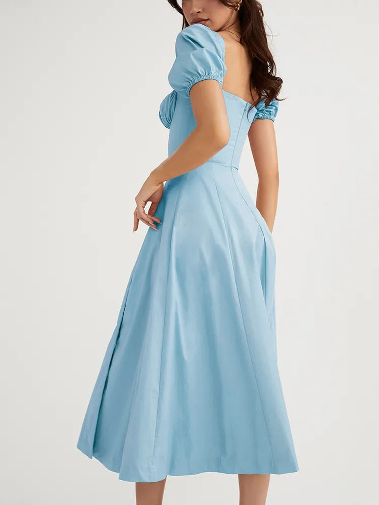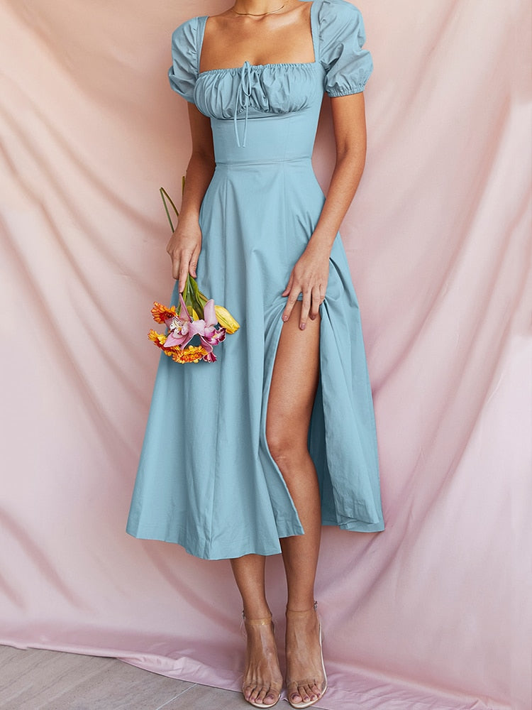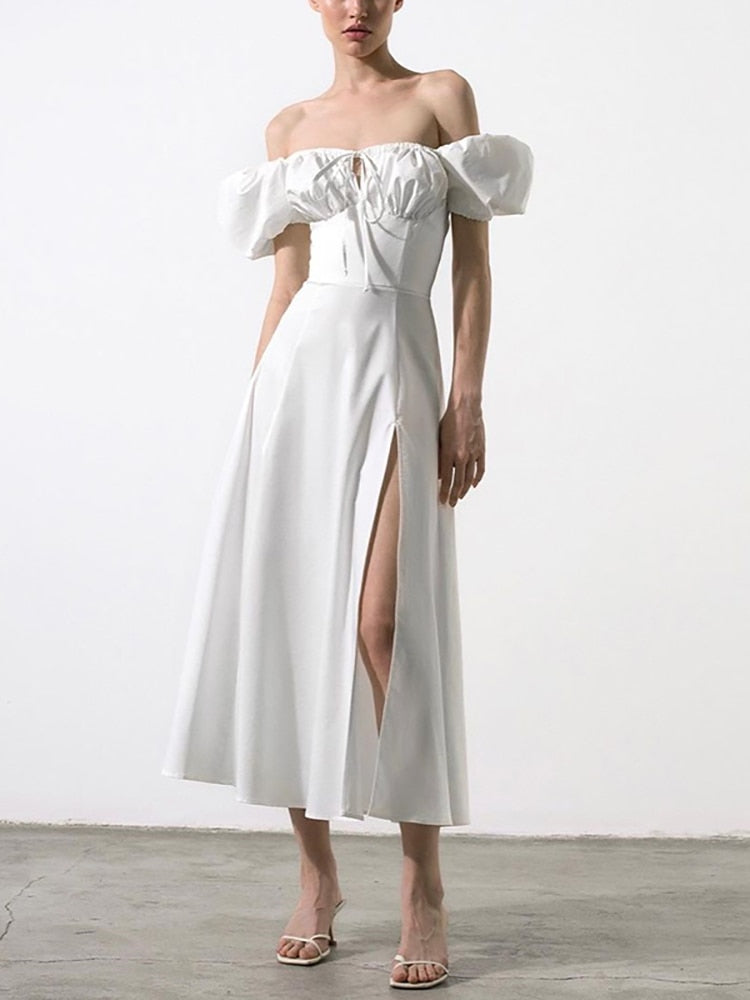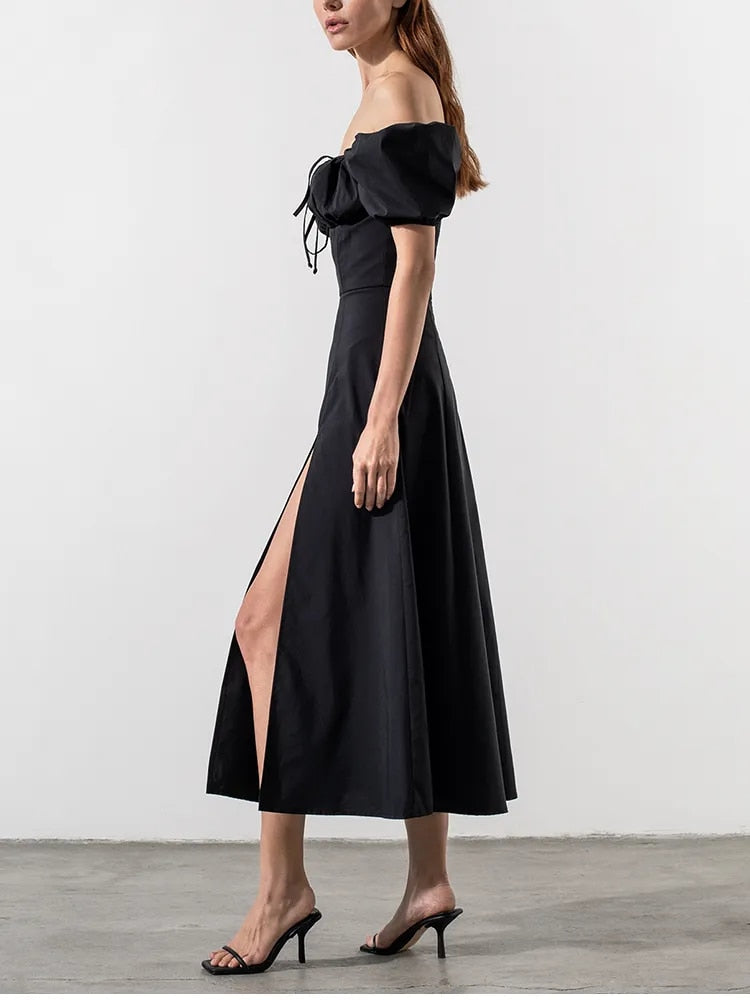 Look your best in the Clancy Ruched Tie-Up Dress by Bella Chix. This chic dress features an off-shoulder cut-out. as well as a tie-up side and split detail for added style. With a ruched design and puff sleeves. this long dress will be the perfect addition to your wardrobe.