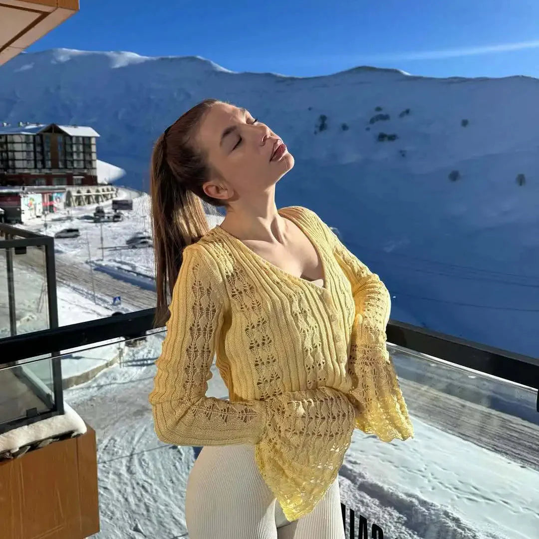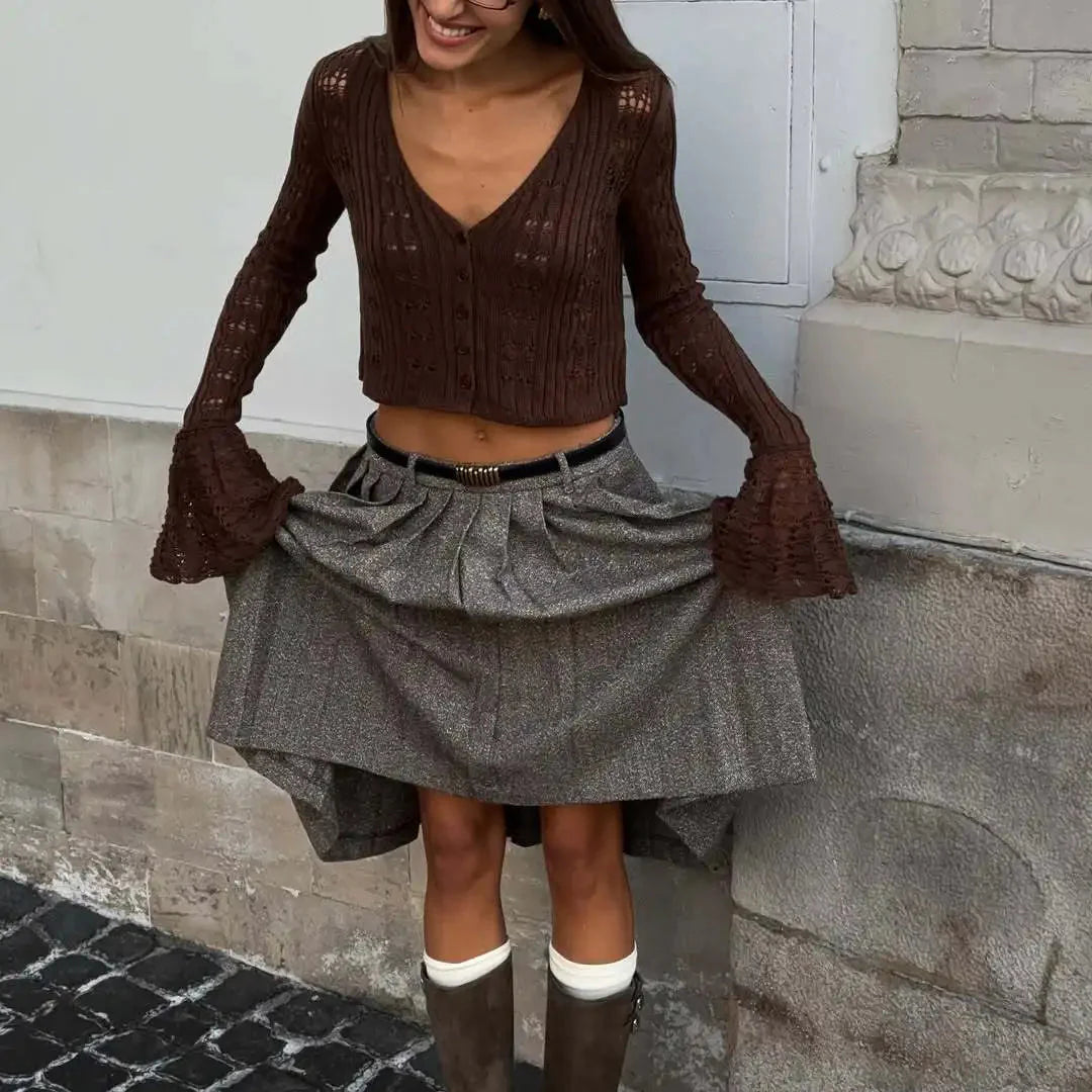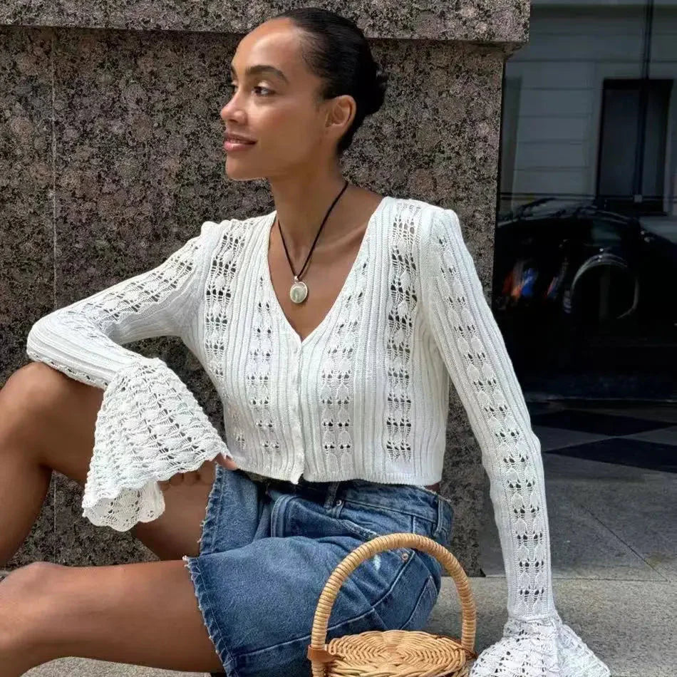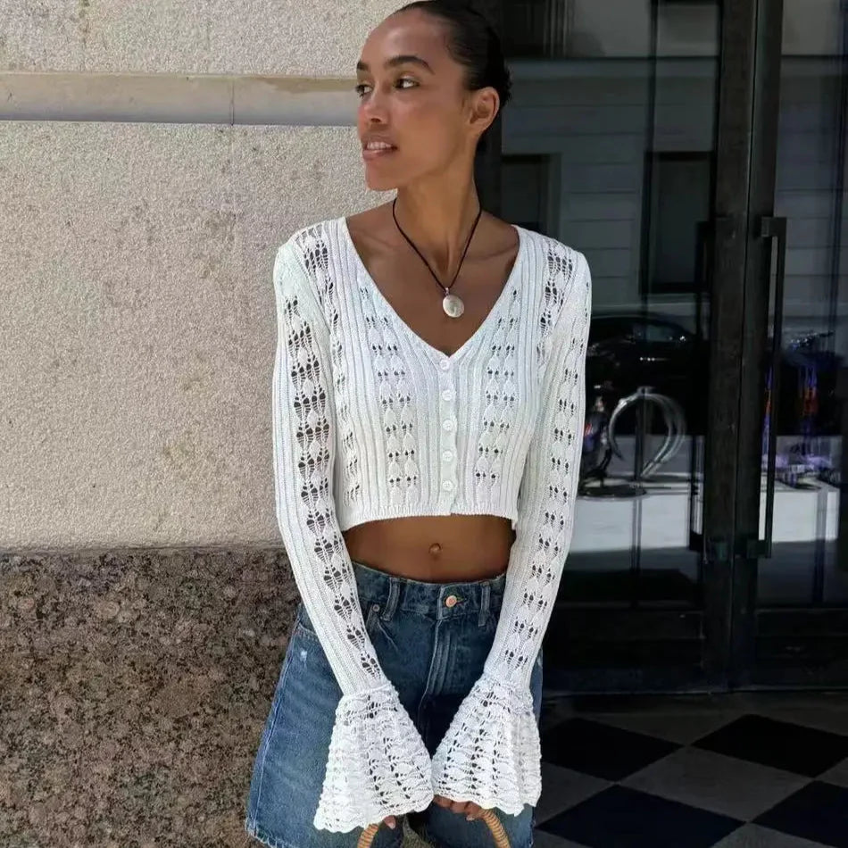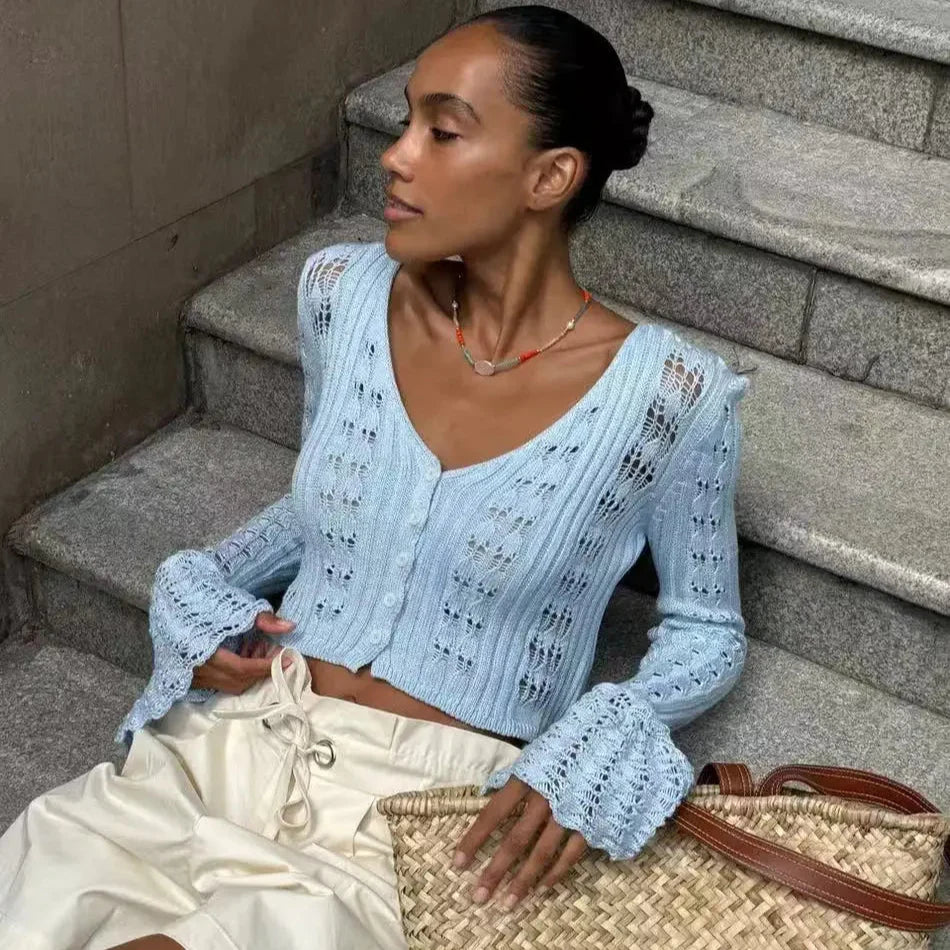 Be effortlessly stylish with Bella Chix's Coasting Through Hollow Out Knitted Cardigan. Its V-neck and see-through. short design gives a trendy. playful edge to any outfit. Stay fashion-forward with this knitted top.
