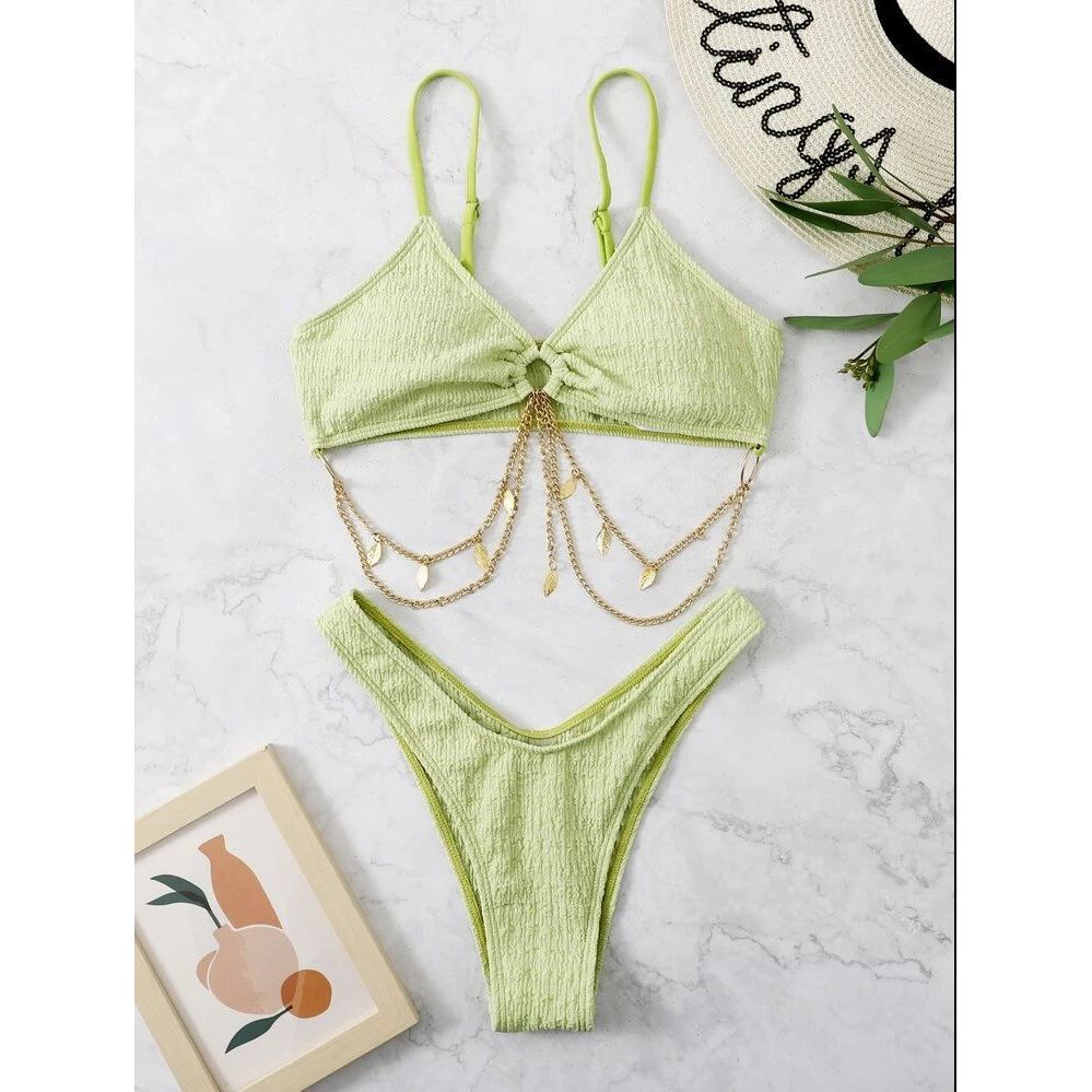 The standout feature of this bikini is its elegant solid color design. enhanced by an eye-catching iron chain accent. This combination creates a chic and edgy look that sets it apart from traditional swimwear.