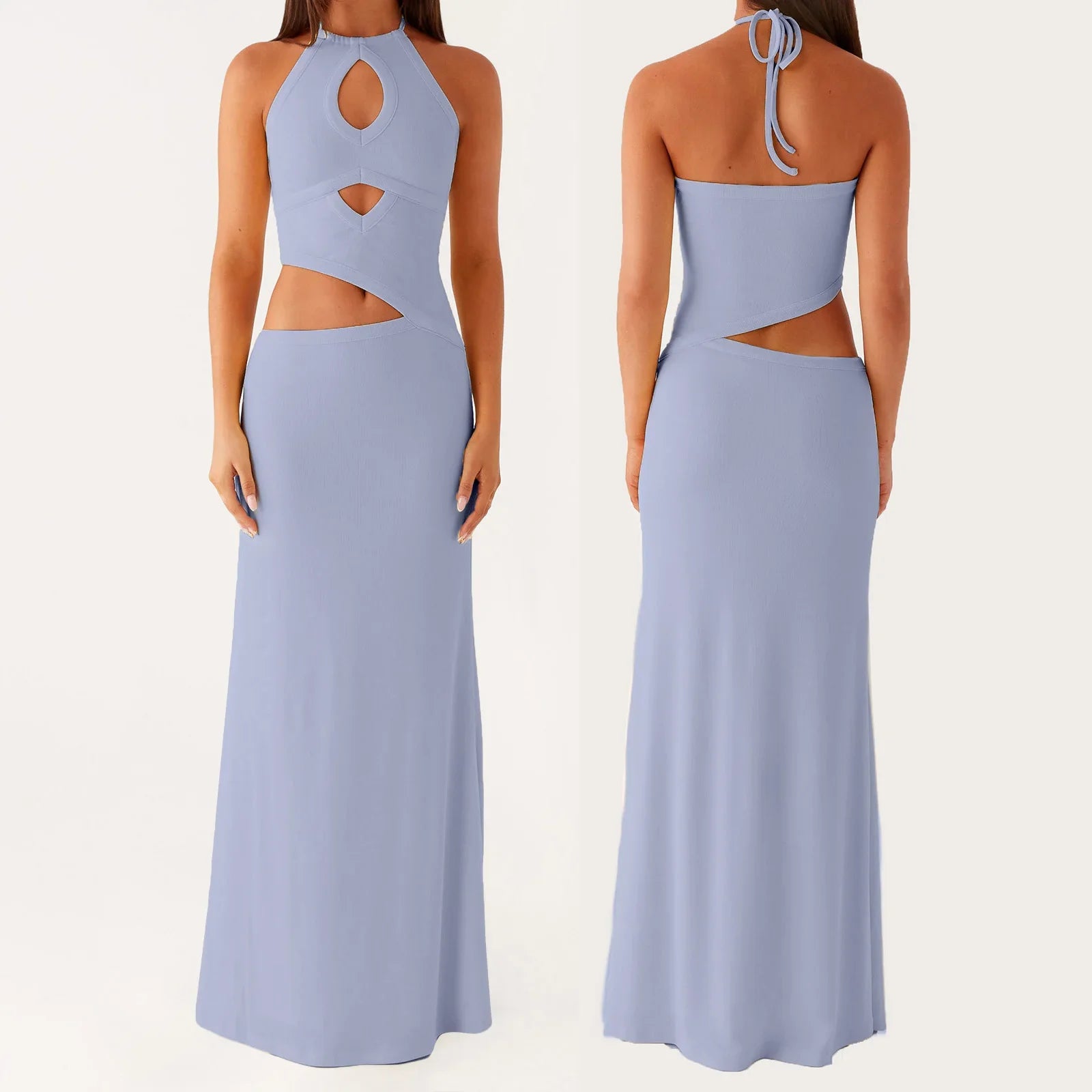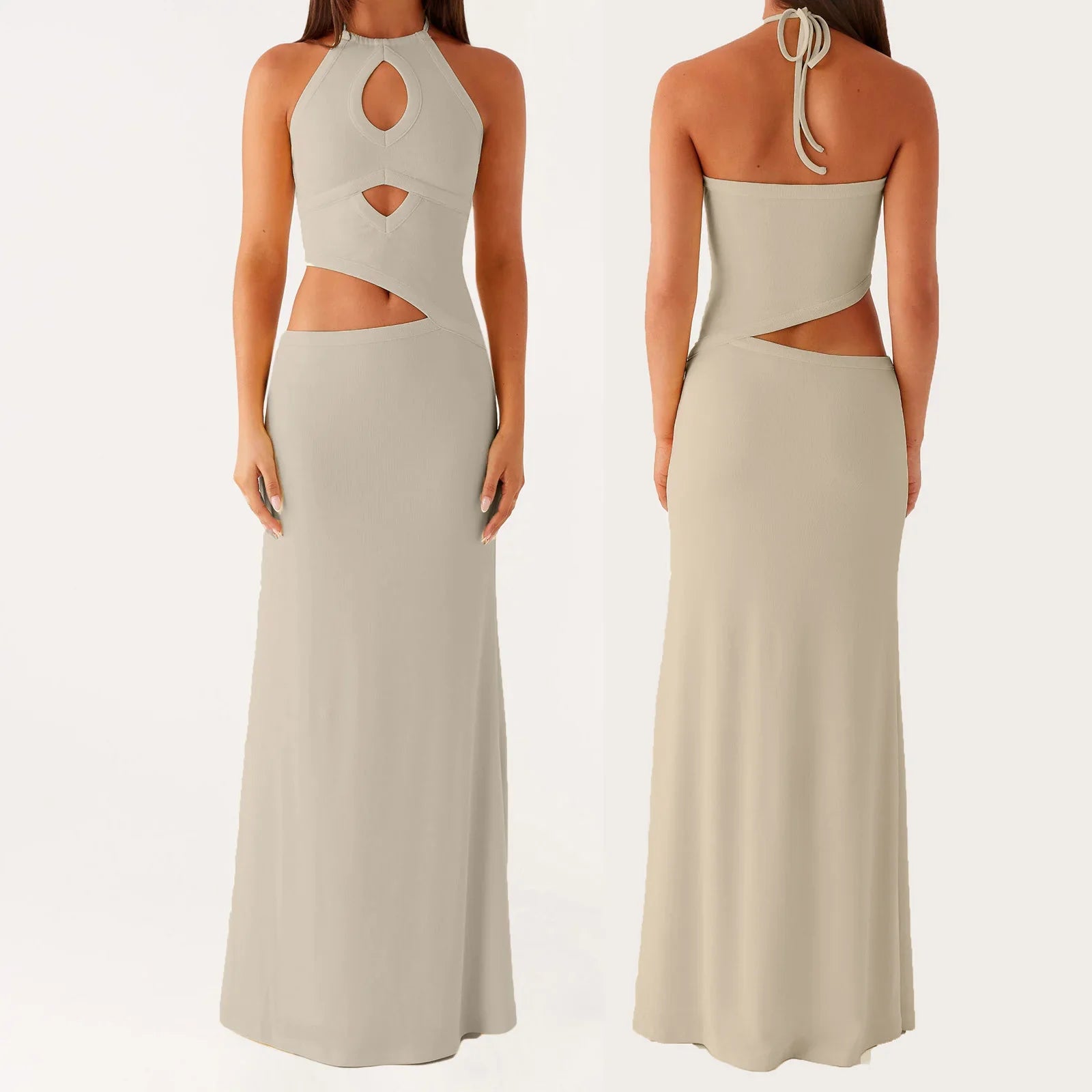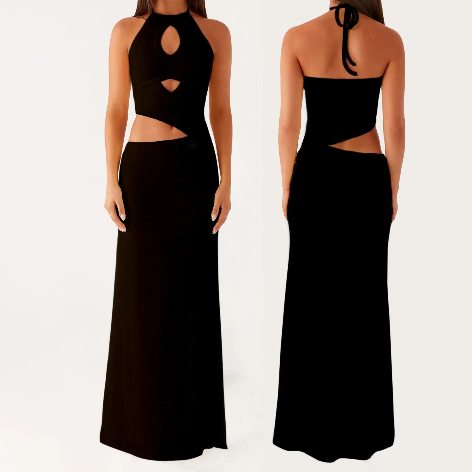 Make a sleek statement with our Cutout Solid Long Dress. a sophisticated choice for any adult wardrobe. This elegant dress features a modern halter neckline that beautifully frames your shoulders. leading into chic cutout details that add a touch of allure. Its A-LINE silhouette gracefully flows to an ankle-length. creating a lean and flattering profile.