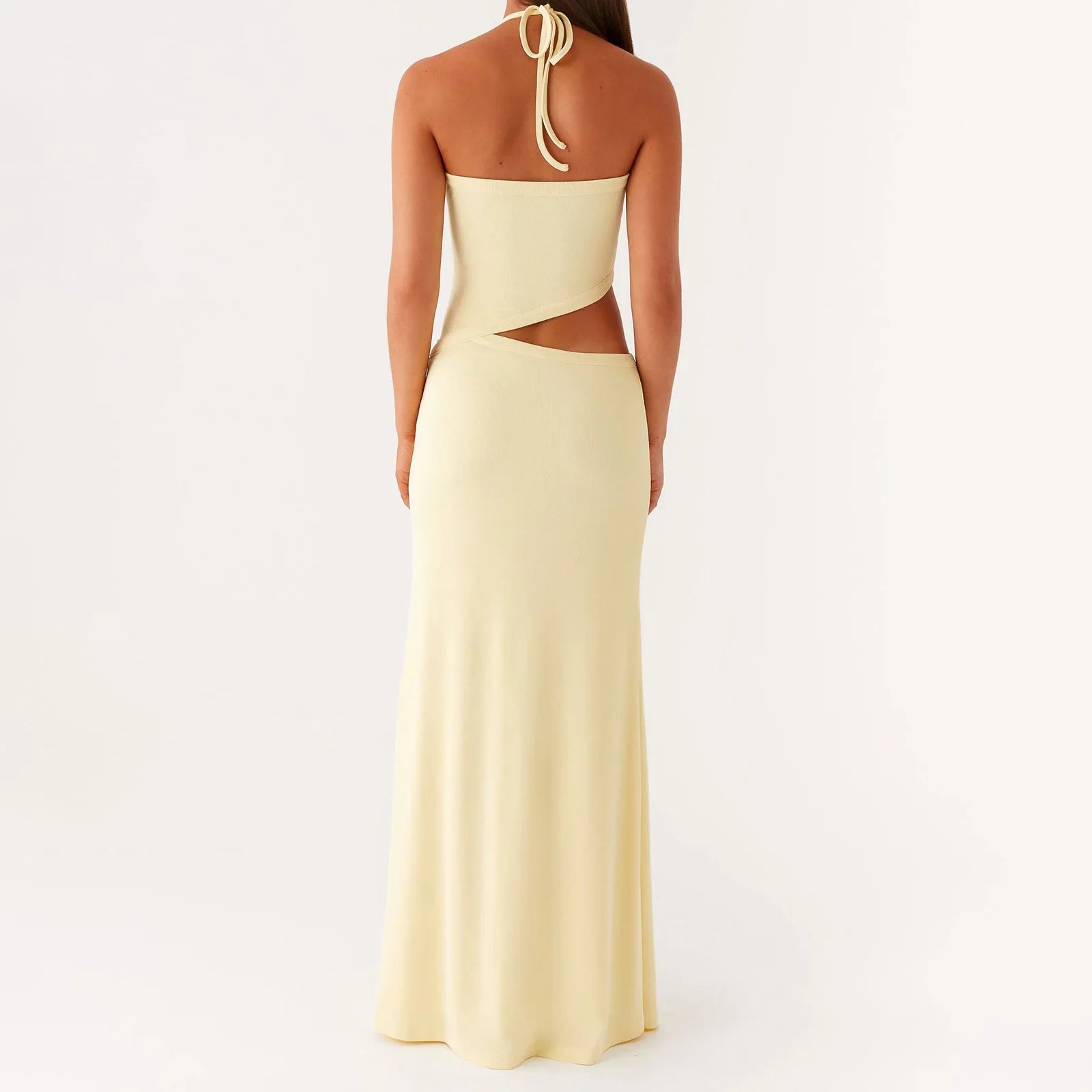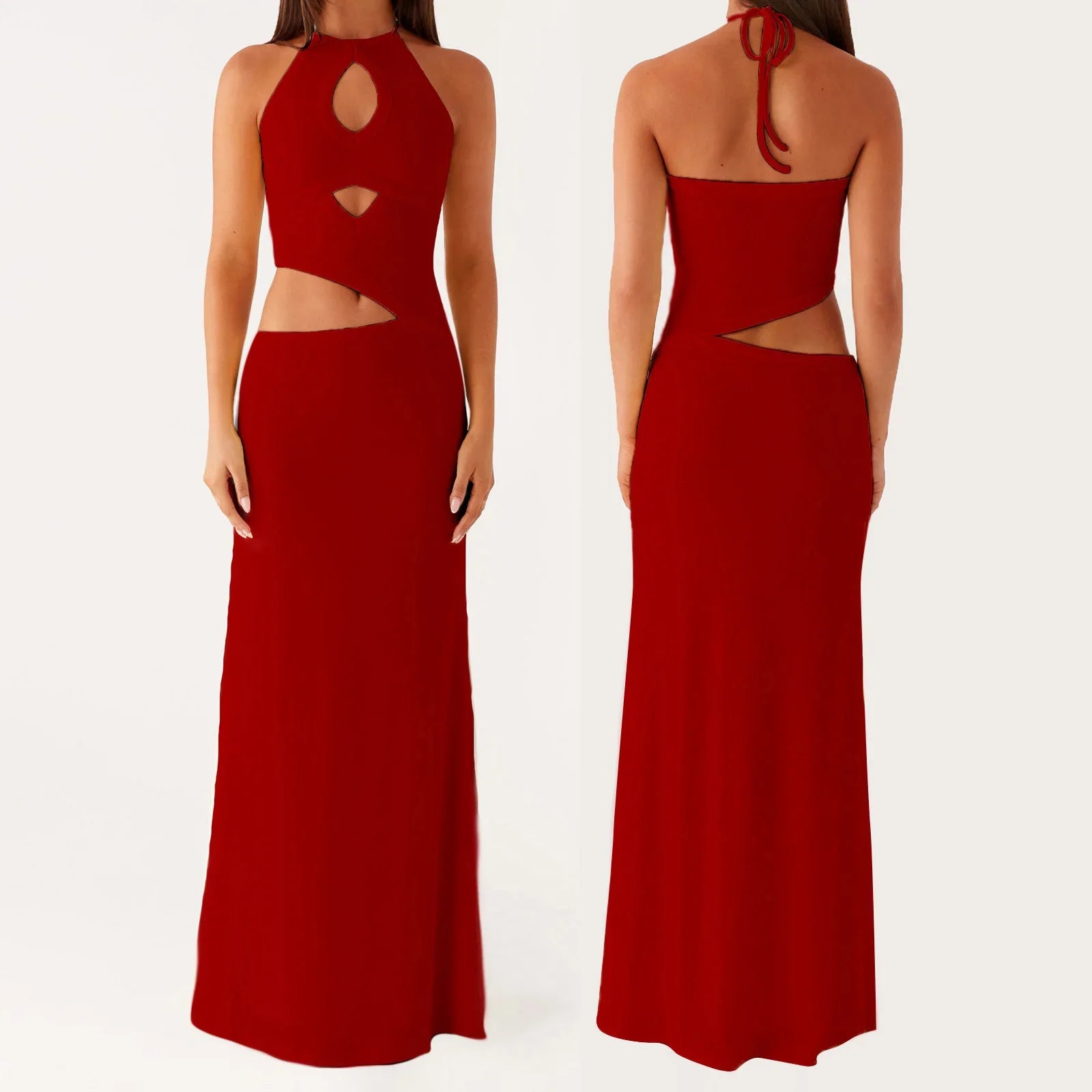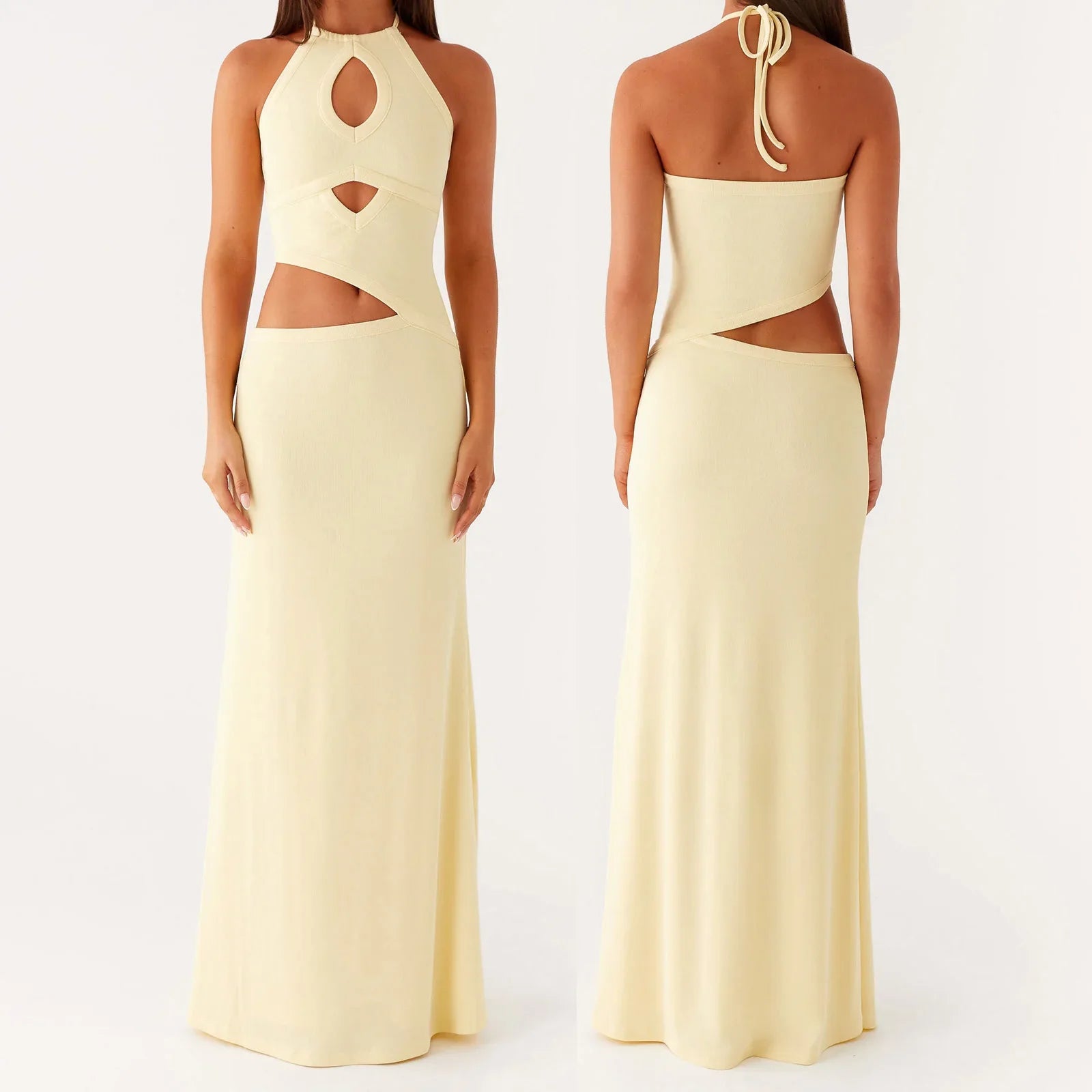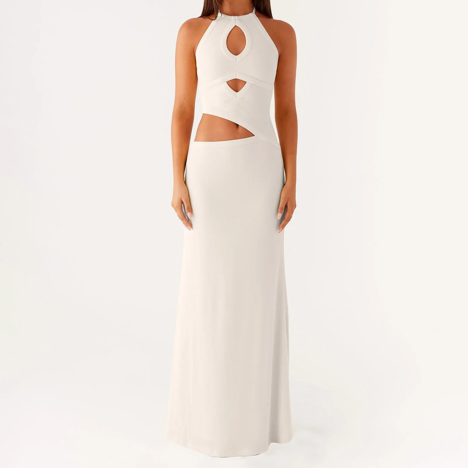 Make a sleek statement with our Cutout Solid Long Dress. a sophisticated choice for any adult wardrobe. This elegant dress features a modern halter neckline that beautifully frames your shoulders. leading into chic cutout details that add a touch of allure. Its A-LINE silhouette gracefully flows to an ankle-length. creating a lean and flattering profile.
