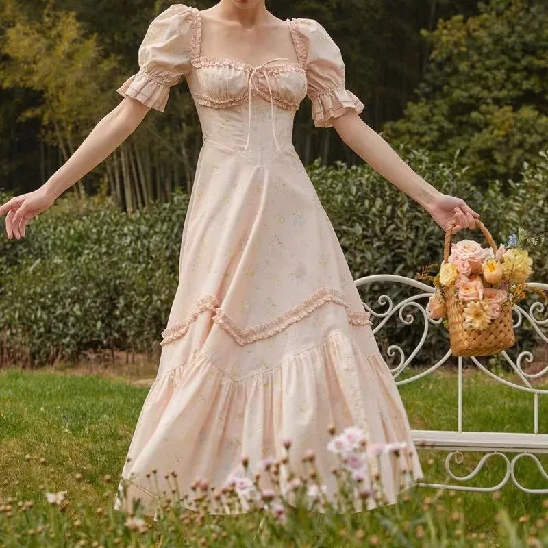 Floral Print Puff Ruffles Sleeve Midi Dress