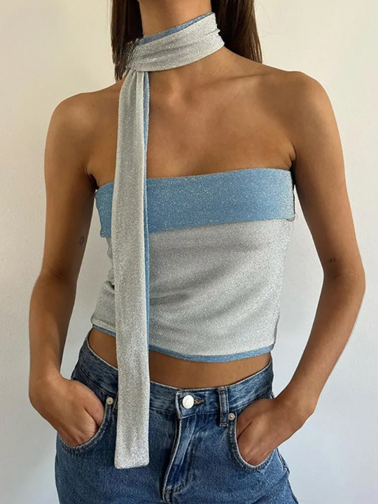 Unleash your inner fashionista with the Glimmer Skinny Sleeveless Crop Top by Bella Chix. This strapless tube top features a unique scarf style that will make you stand out from the crowd. Perfect for any occasion. this top will add a touch of glam to any outfit!
