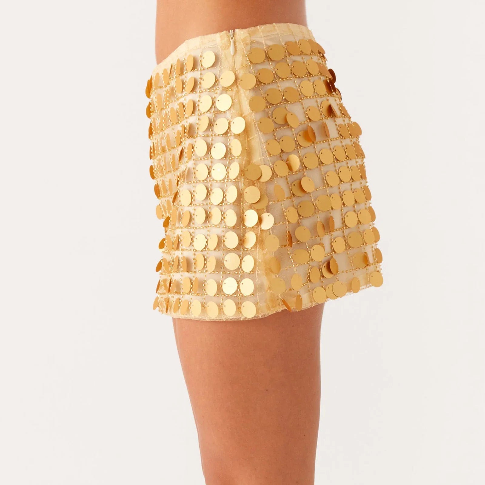 Sparkle and shine in our Gold Sequin Beaded Mini Skirt. a dazzling addition for any adult wardrobe. This eye-catching skirt features a radiant gold sequin and beaded design. bringing a luxurious and playful shimmer to your look. Its flattering A-LINE silhouette and above-knee mini length are perfect for making a statement at any event.