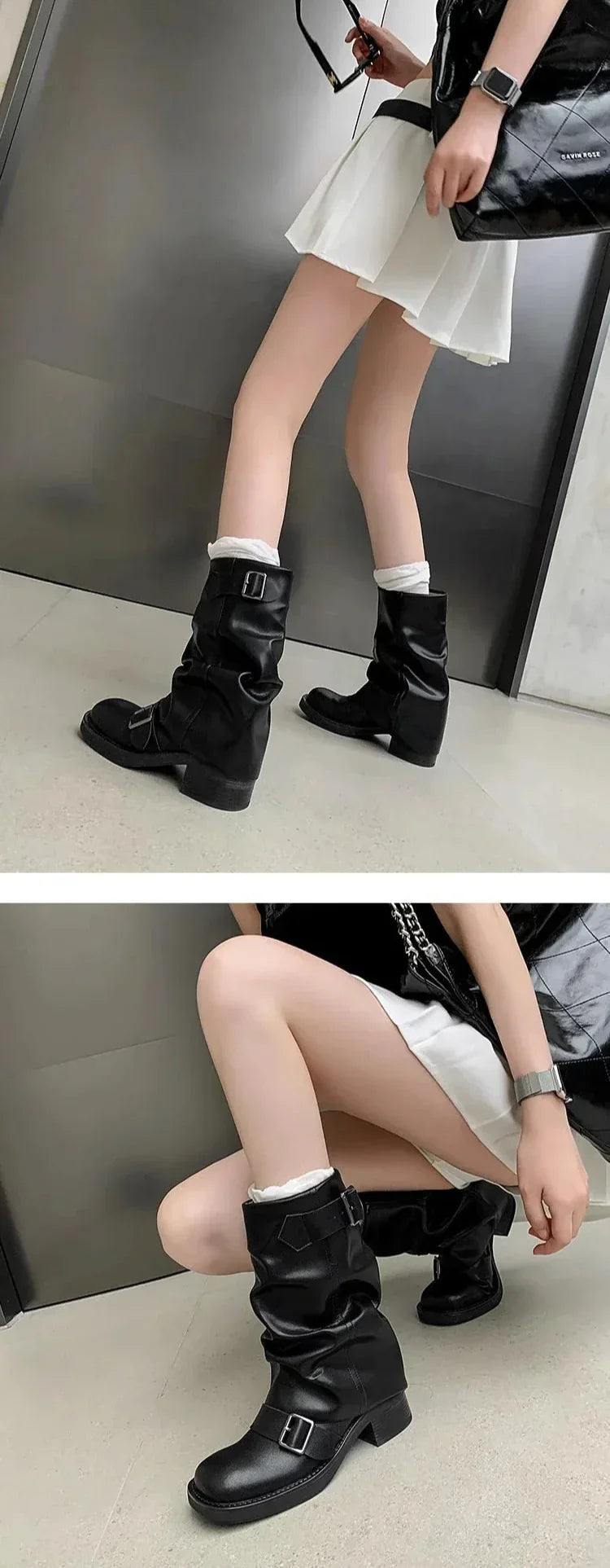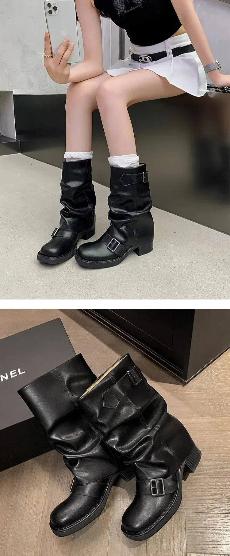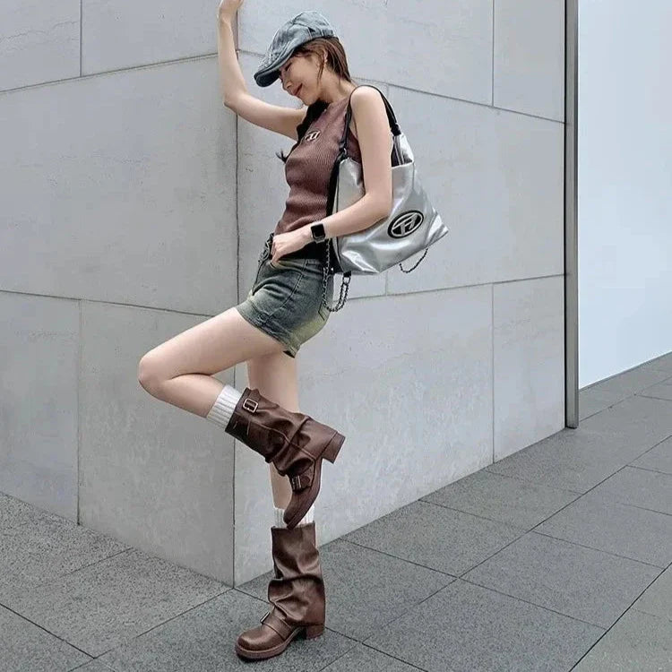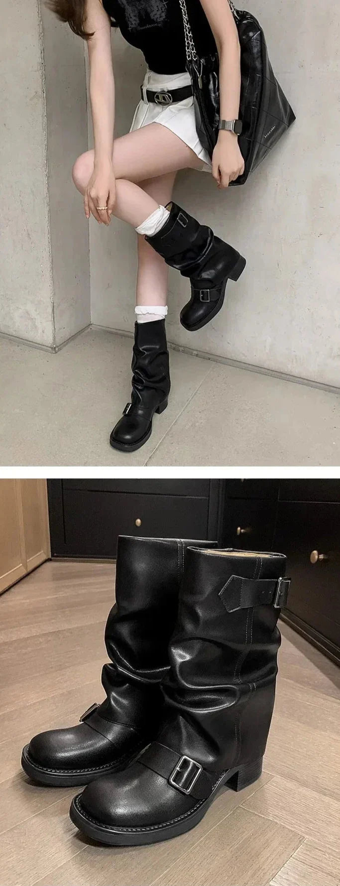 Take a walk on the funky side with the Hilania Pleated Mid Calf Boots by Bella Chix! These leather boots feature a pleated design and buckle detailing. giving them a unique and stylish look. With a slip-on style and thick heel for comfortable riding. you'll be ready to conquer the day in these knight-inspired boots.