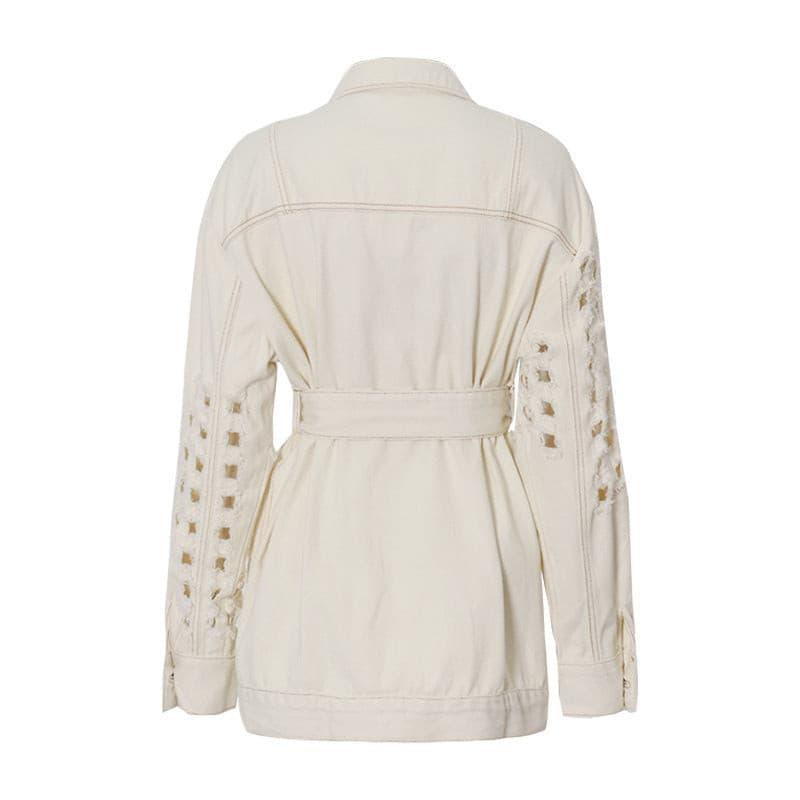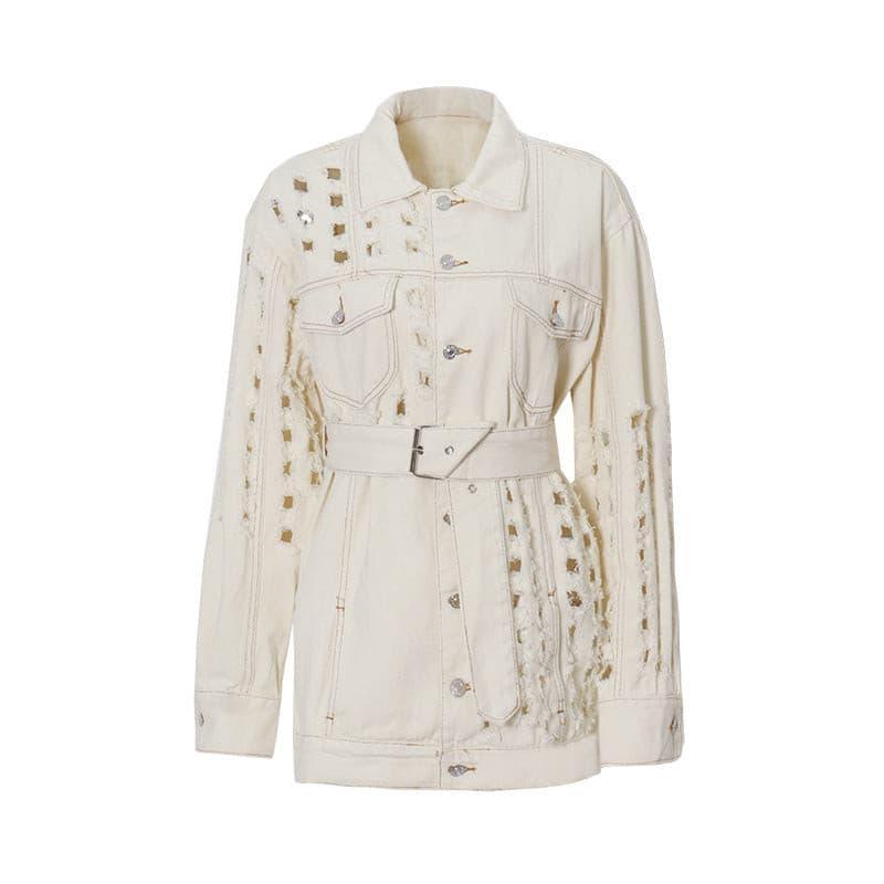 With its long regular sleeves and stylish lapel collar. this jacket effortlessly combines comfort and trendiness. The eye-catching hole details add an edgy twist. while the available colors of blue and off-white ensure versatility in your wardrobe. Perfect for the modern hipster. this jacket is available in sizes S and M. making it a must-have for those who dare to be different.