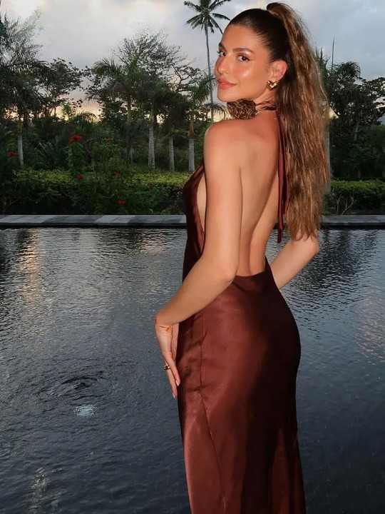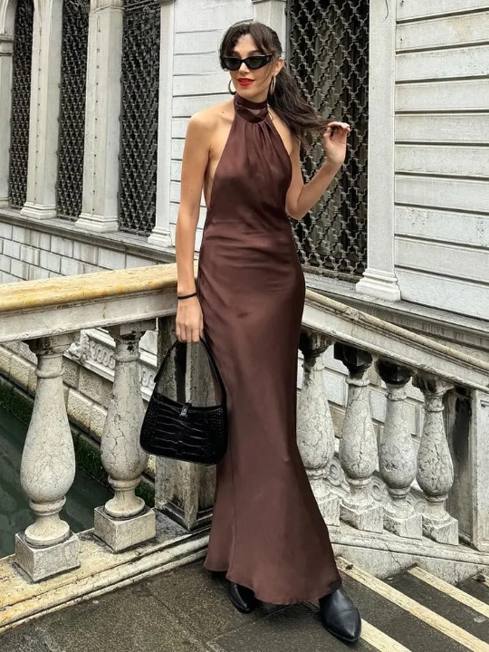 Add a touch of whimsy to your wardrobe with Bella Chix's Holly Satin Halter Neck Dress. This midi dress features a halter neckline and tied backless design. perfect for parties or a night out. The pleated details add texture and the brown color adds a touch of sophistication. (Just don't call it a "Little Brown Dress" - it's anything but little!)