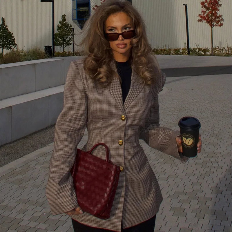 Take on the work day with the Juliet Plaid Long Sleeved Jacket by Bella Chix. This stylish coat features a V-neck and long sleeves for a polished look. while the button closure adds a touch of elegance. Perfect for the office. this jacket will have you feeling confident and empowered.
