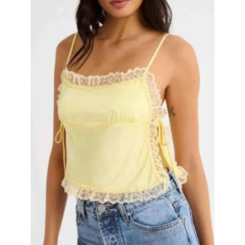 Embrace summer luxe with our Lace Trim Satin Cami Top. a must-have for your high-street inspired wardrobe. This alluring piece features delicate lace trim that adds a touch of sophistication and an enticing open back for a hint of allure. Crafted from a smooth spandex broadcloth with slight stretch. it offers a comfortable and flattering short length. Perfect for layering under blazers. pairing with high-waisted denim. or as a standalone statement piece for warm evenings. this cami top is designed for those who appreciate effortless elegance and versatile styling during the sunny season.