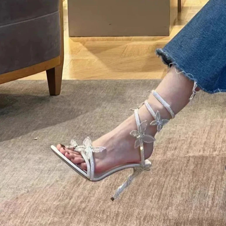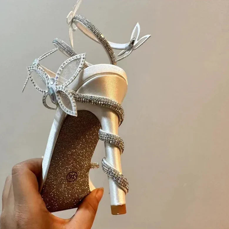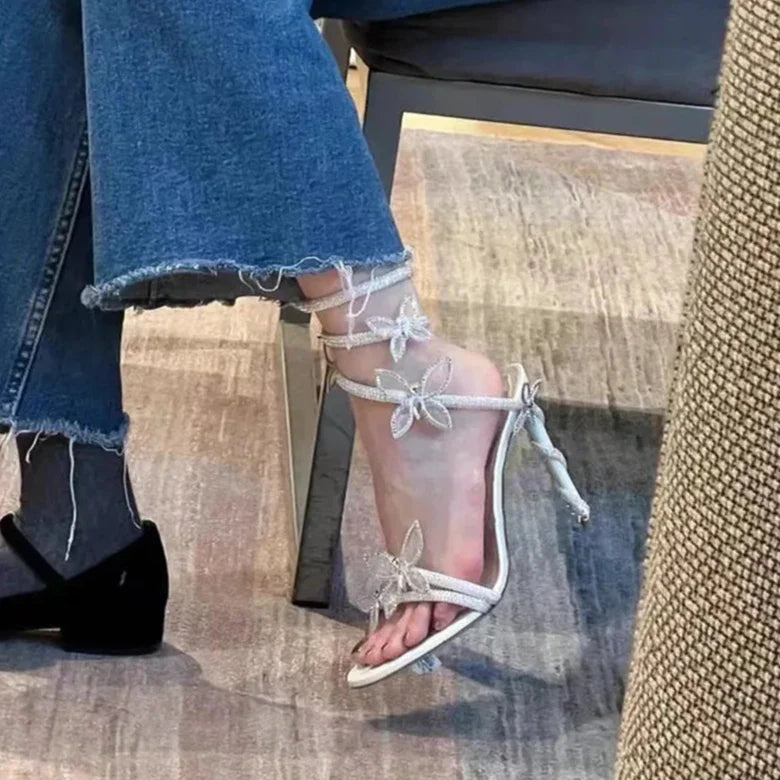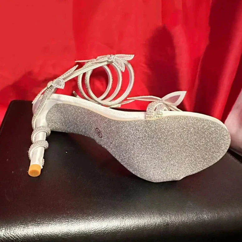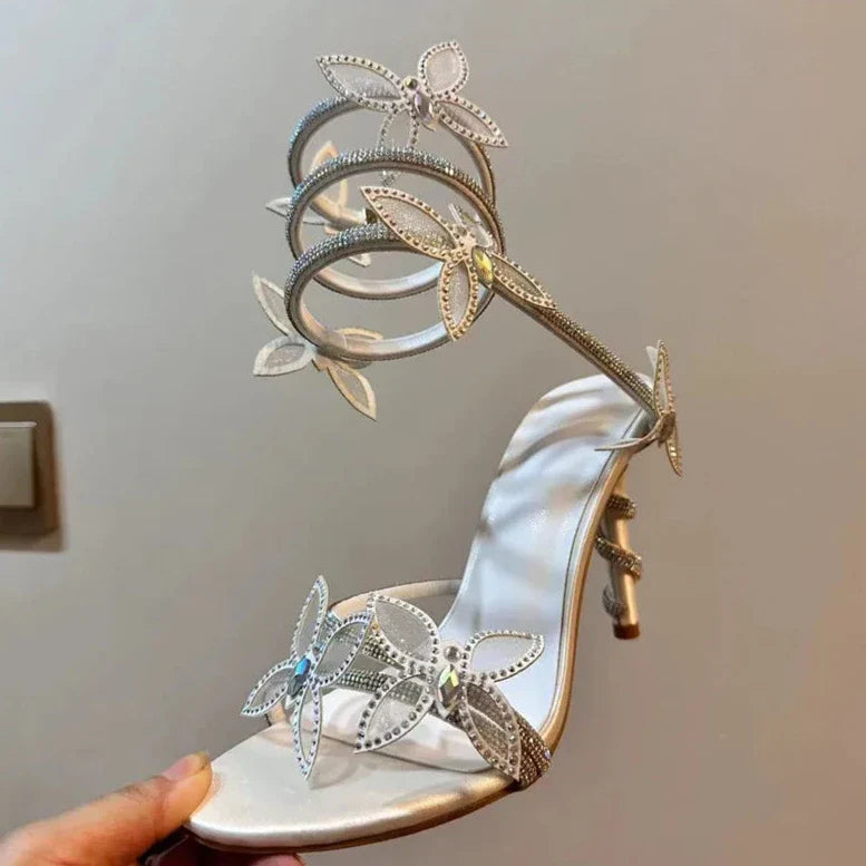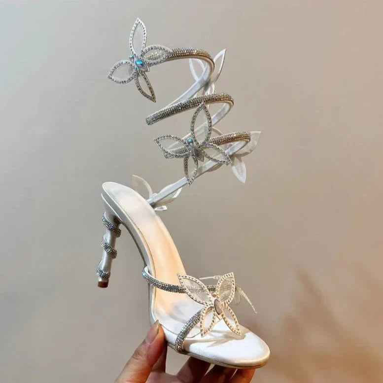 Step into the whimsical world of Lost Love Butterfly Gladiator Heels by Bella Chix! These high heels feature a coiled strap adorned with sparkling crystals. reminiscent of a butterfly's wings. With thin heels for a classy touch. channel your inner goddess and conquer the day in style. 👠🦋