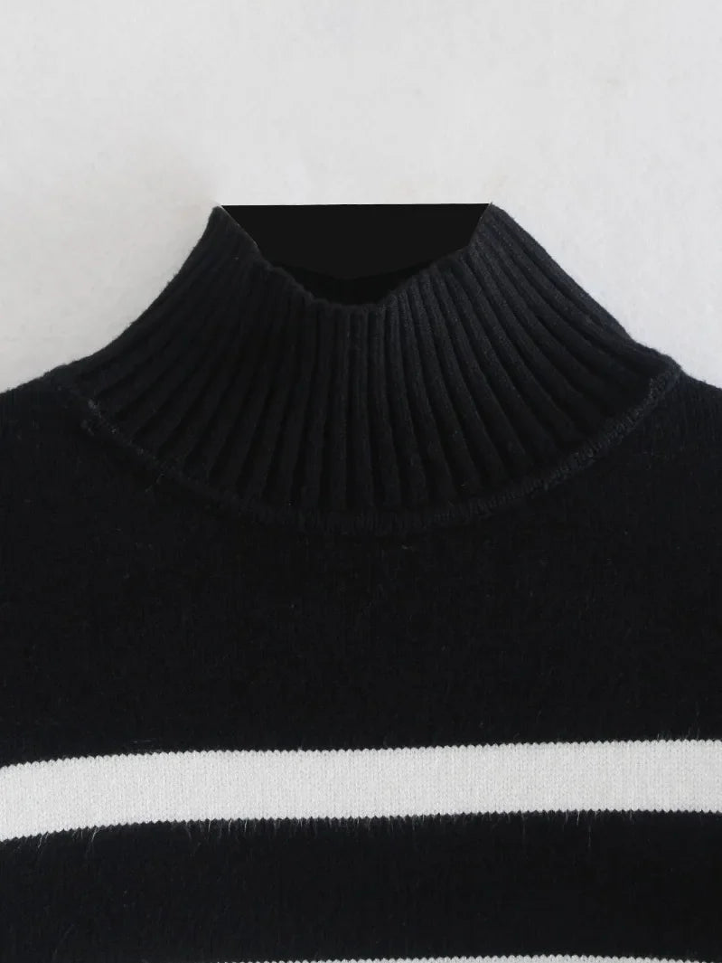 Get ready to rock the oversized trend with the Madisyn Stripe Turtleneck Sweater by Bella Chix! With black and white stripes and a cozy knitted fabric. this long-sleeve sweater is perfect for staying stylish and comfortable. Add some edginess to your wardrobe and embrace the oversized silhouette. (Just don't get lost in it!)
