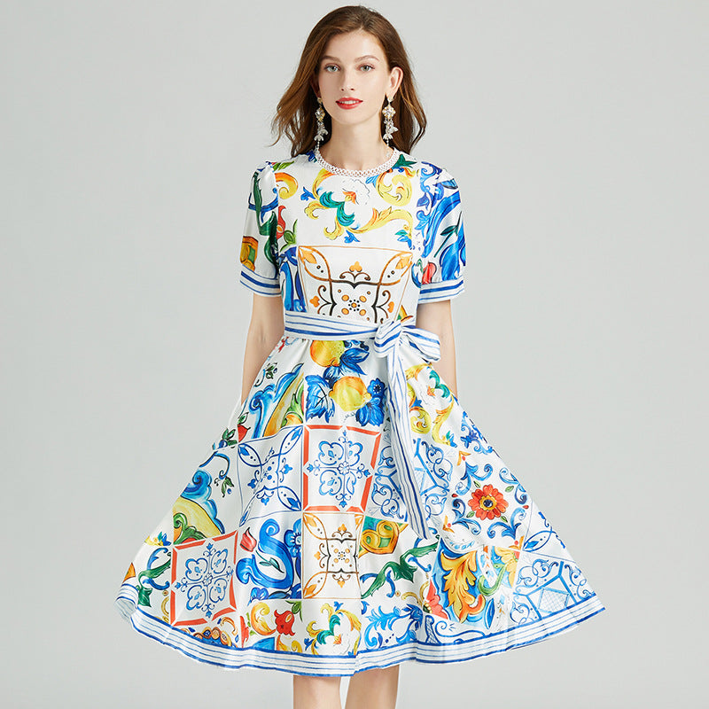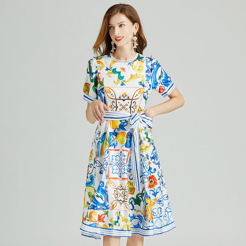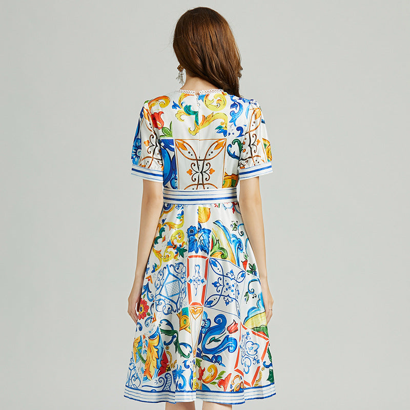 Majolica Print Tie Waist Midi Dress Flaxmaker