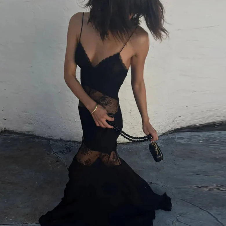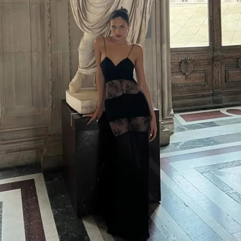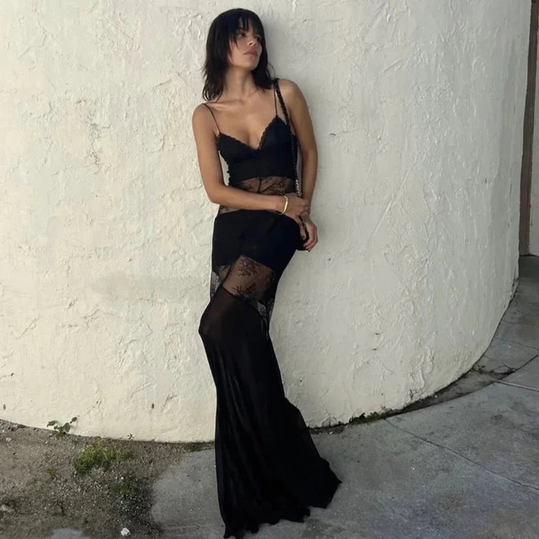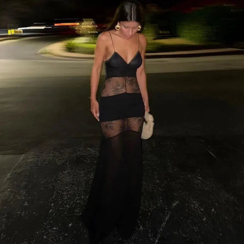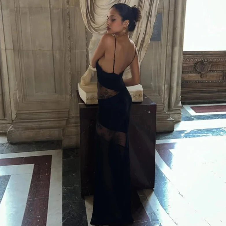 Unleash your inner seductress with Bella Chix's Noelia See Through Sling Maxi Dress. Featuring delicate lace and a see through design. this dress is perfect for making a sexy statement. The slim. black. backless. and sleeveless silhouette adds to the allure. making you feel confident and alluring.