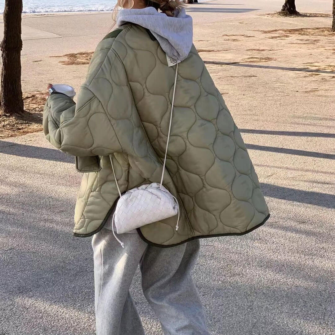 Don't be shy to follow your taste in fashion by choosing this contrasted puffer jacket. Made of blend polyester. embellished with wave quilt designs allover presented with contrasting color blocks. featuring a collarless neckline followed with a buttoned placket. dropped shoulders embodied with long sleeves and split cuffs. flap front pockets. a boxy & roomy silhouette adorned with a curved split hem. ending up in a long length. Find more trendy women's longline jackets or unique clothing in our boutique. and complete an attractive look with a sportive matching set.