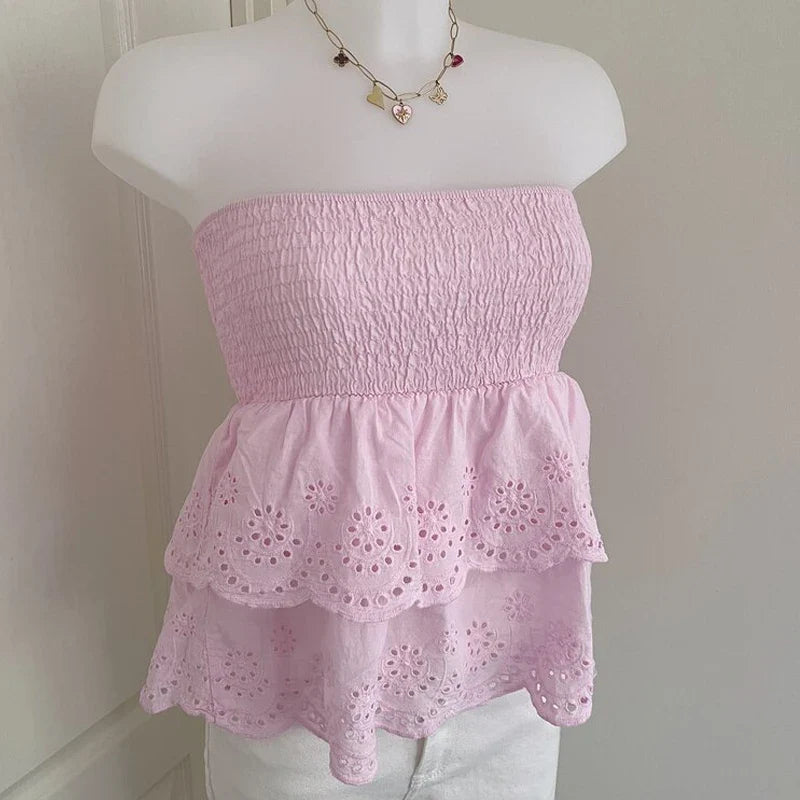 Embrace sweet summer style with our Pink Eyelet Ruched Tube Top. a must-have for any adult wardrobe. This charming top features delicate eyelet detailing combined with flattering ruching (folds). creating a textured and stylish look. Its strapless design highlights your shoulders and collarbone. perfect for warm-weather outfits.