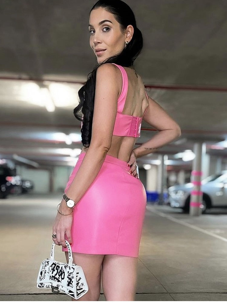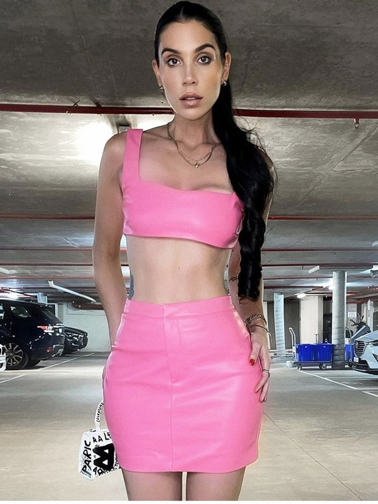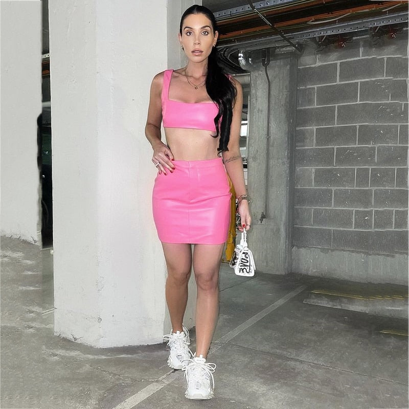 Pink Faux Leather Two Piece Skirt And Bralette Set