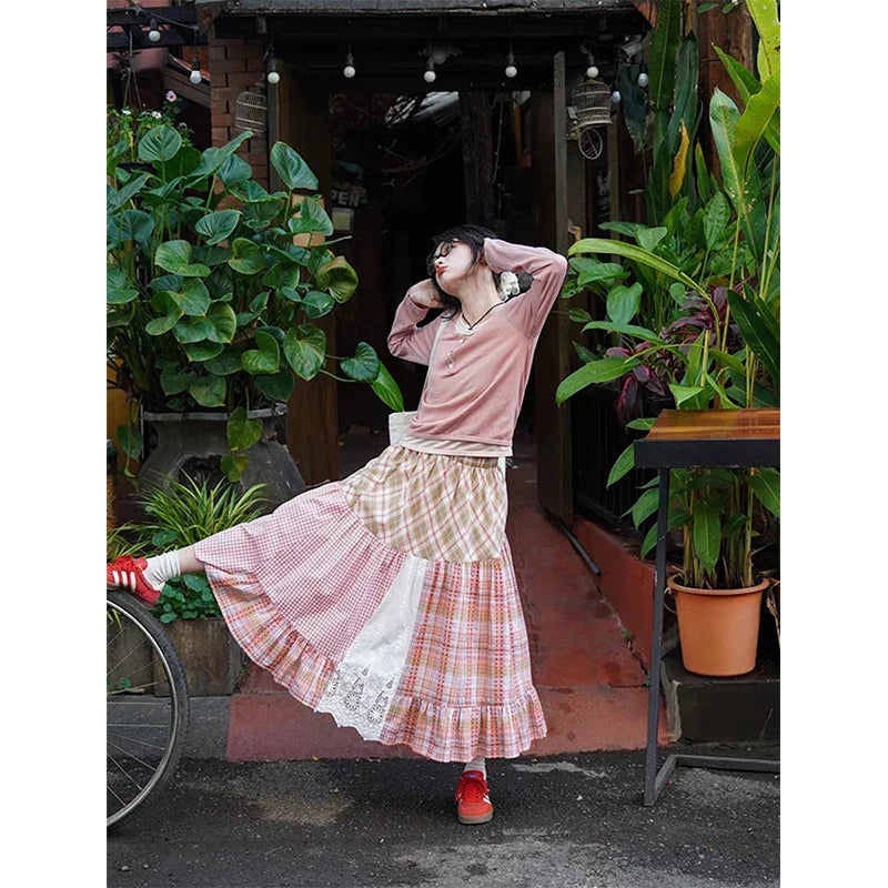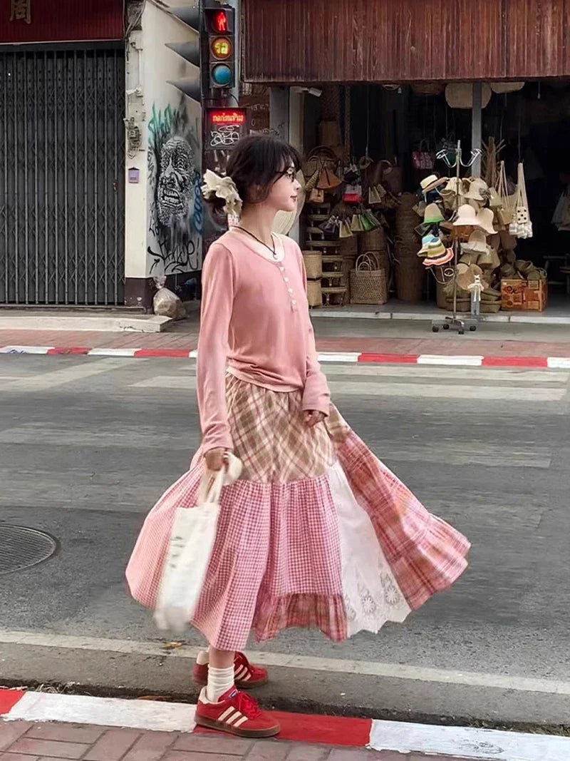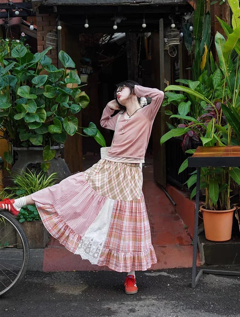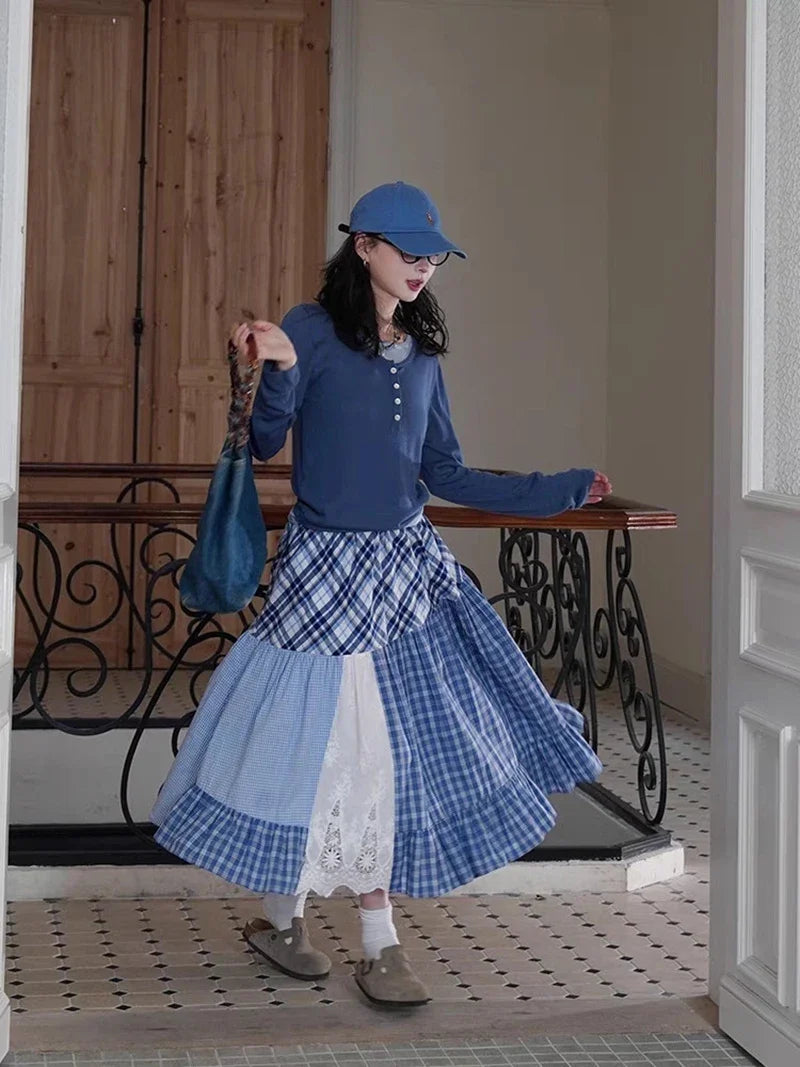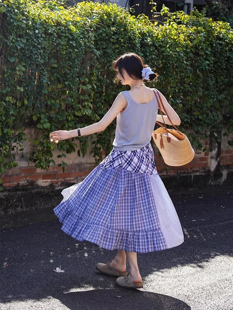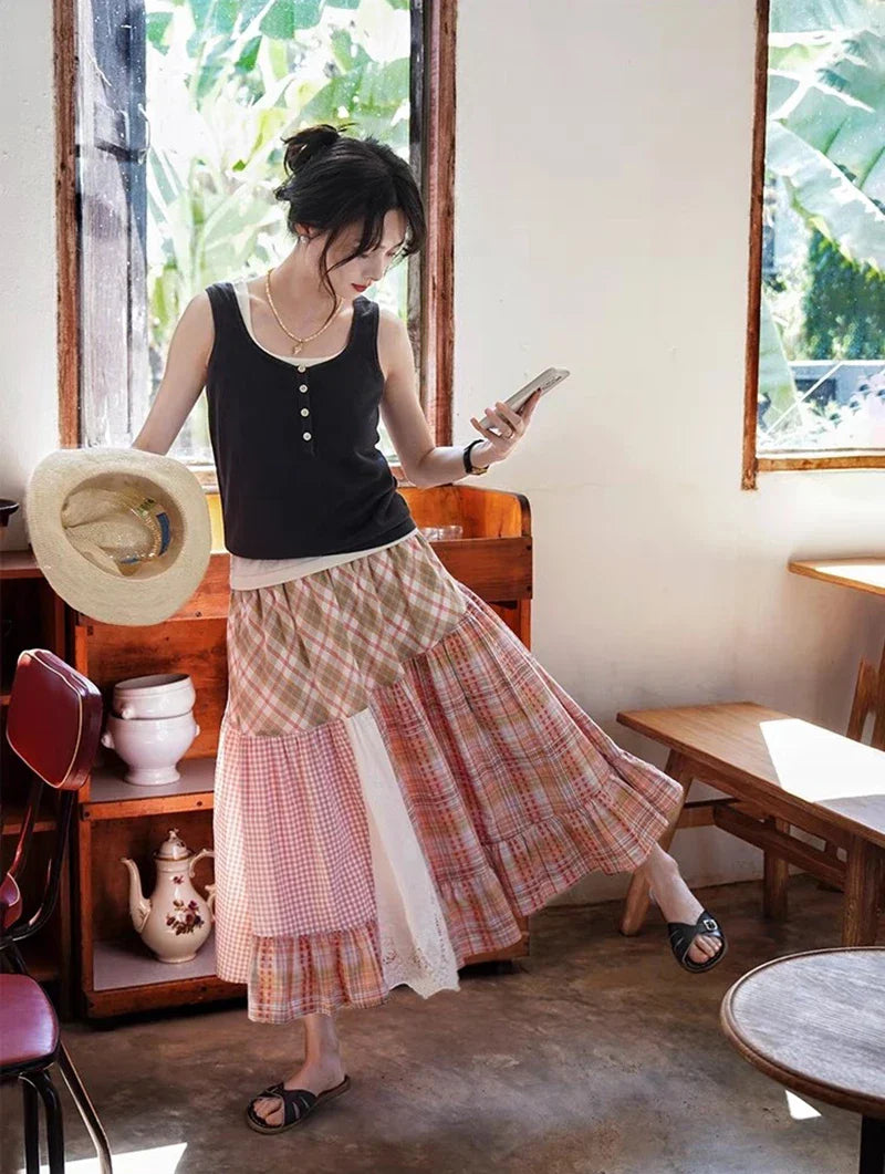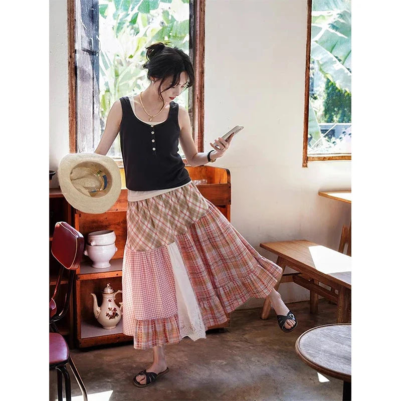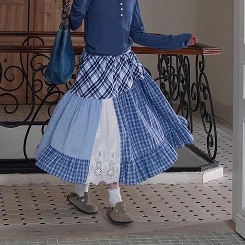 Step out in unique urban style with our Plaid Patchwork Midi Skirt. a trendy addition for any adult wardrobe. This eye-catching skirt features a distinctive plaid pattern with a modern patchwork design. creating a visually rich and dynamic look. Delicate lace decoration adds an intricate touch. enhancing its overall appeal. Its elegant A-LINE silhouette gracefully extends to a mid-calf length. ensuring comfortable movement and a relaxed yet stylish presence.