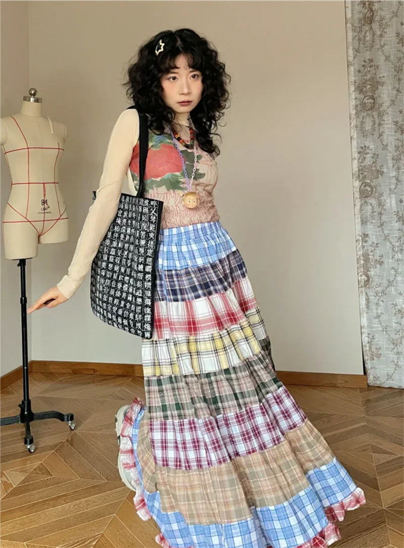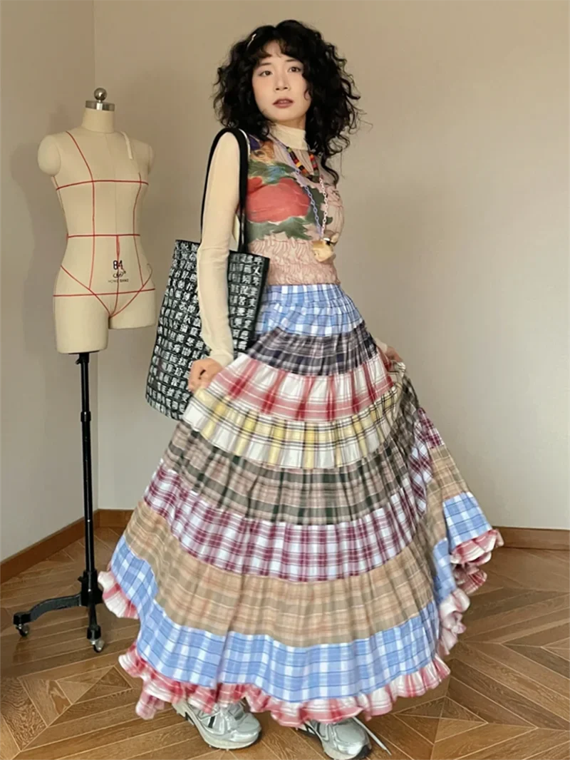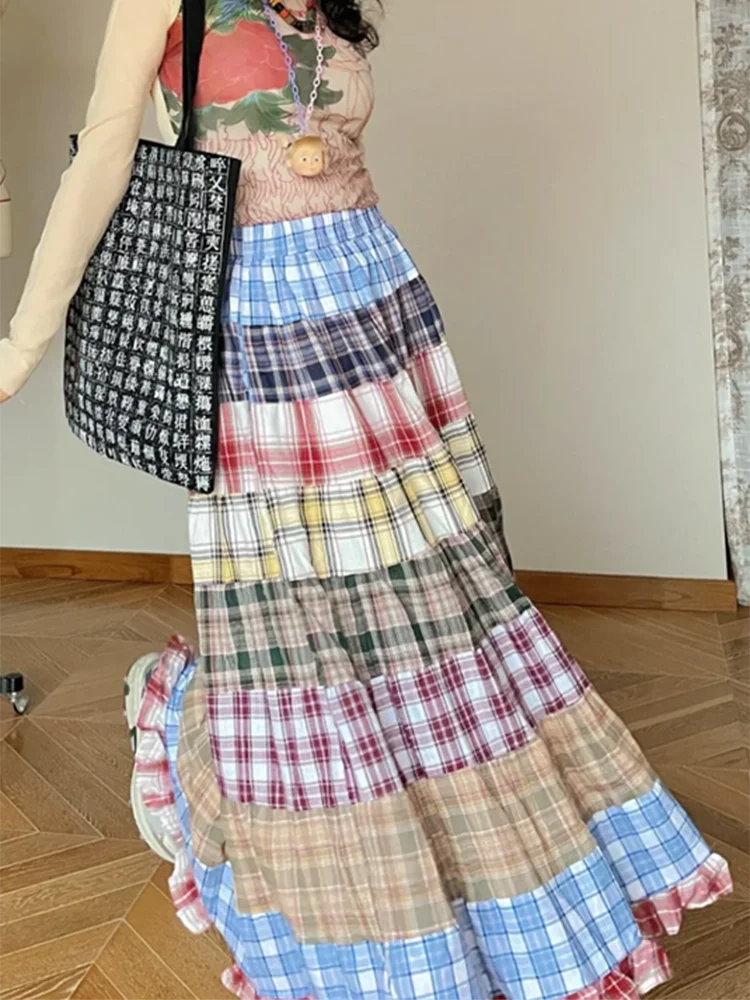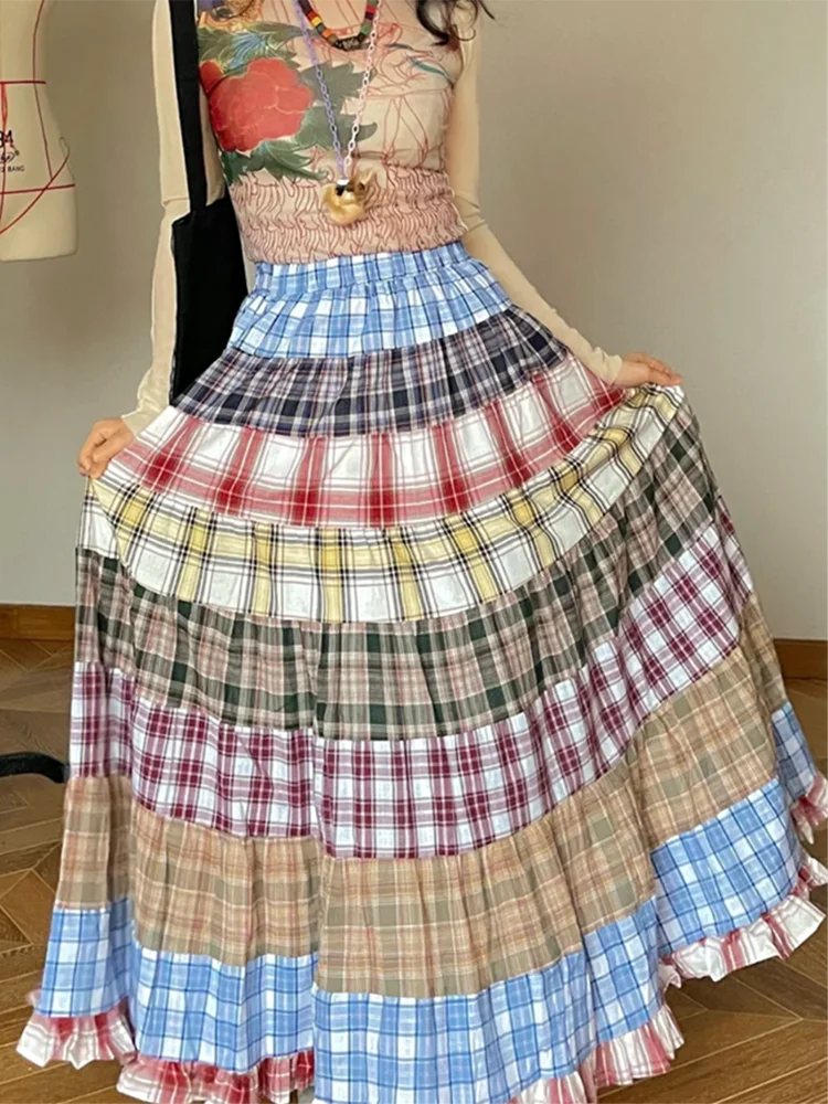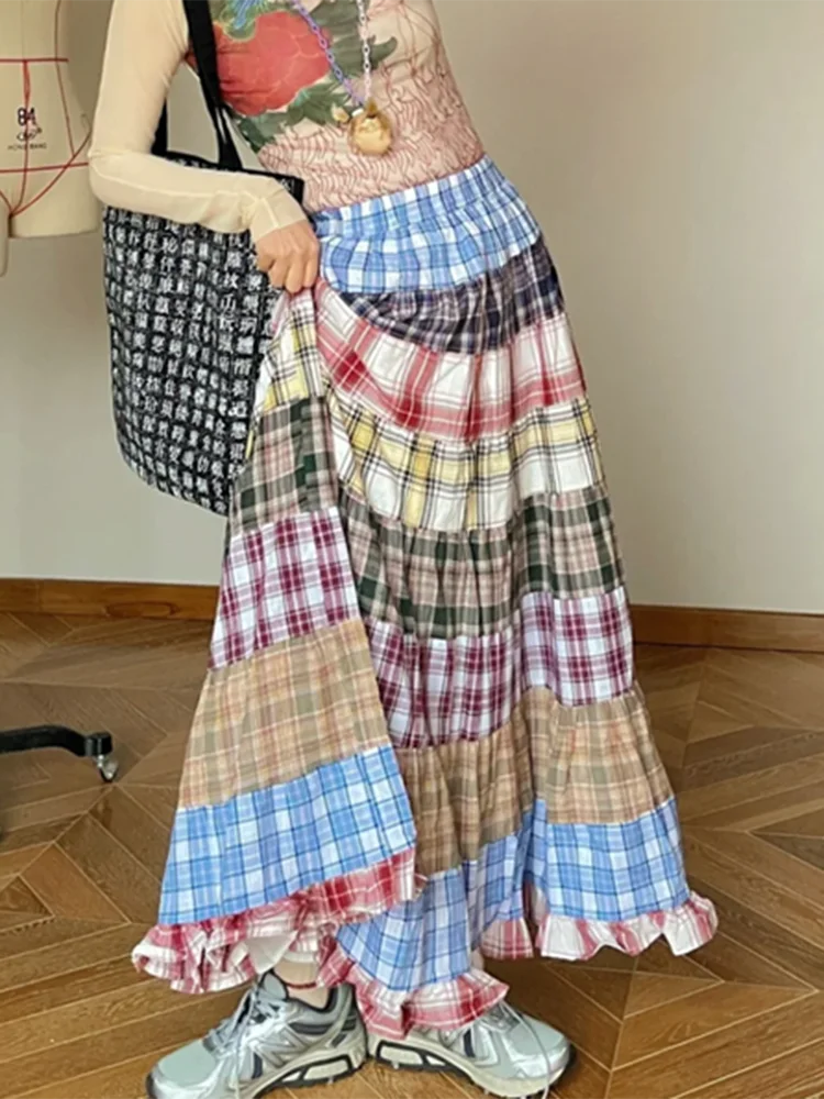 Embrace whimsical bohemian charm with our Plaid Patchwork Ruffles Maxi Skirt. a delightful addition for any adult wardrobe. This eye-catching skirt features a unique patchwork pattern that combines various textures and plaid elements. creating a visually rich and distinctive look. Playful ruffle decoration (implied by title. "None" in decoration spec could indicate subtle integration into fabric) adds a touch of whimsical flair. enhancing its flowing silhouette. Its elegant A-LINE silhouette gracefully extends to a mid-calf length. ensuring comfortable movement and a relaxed yet stylish presence.