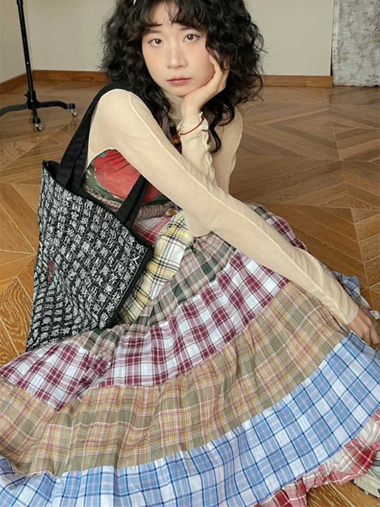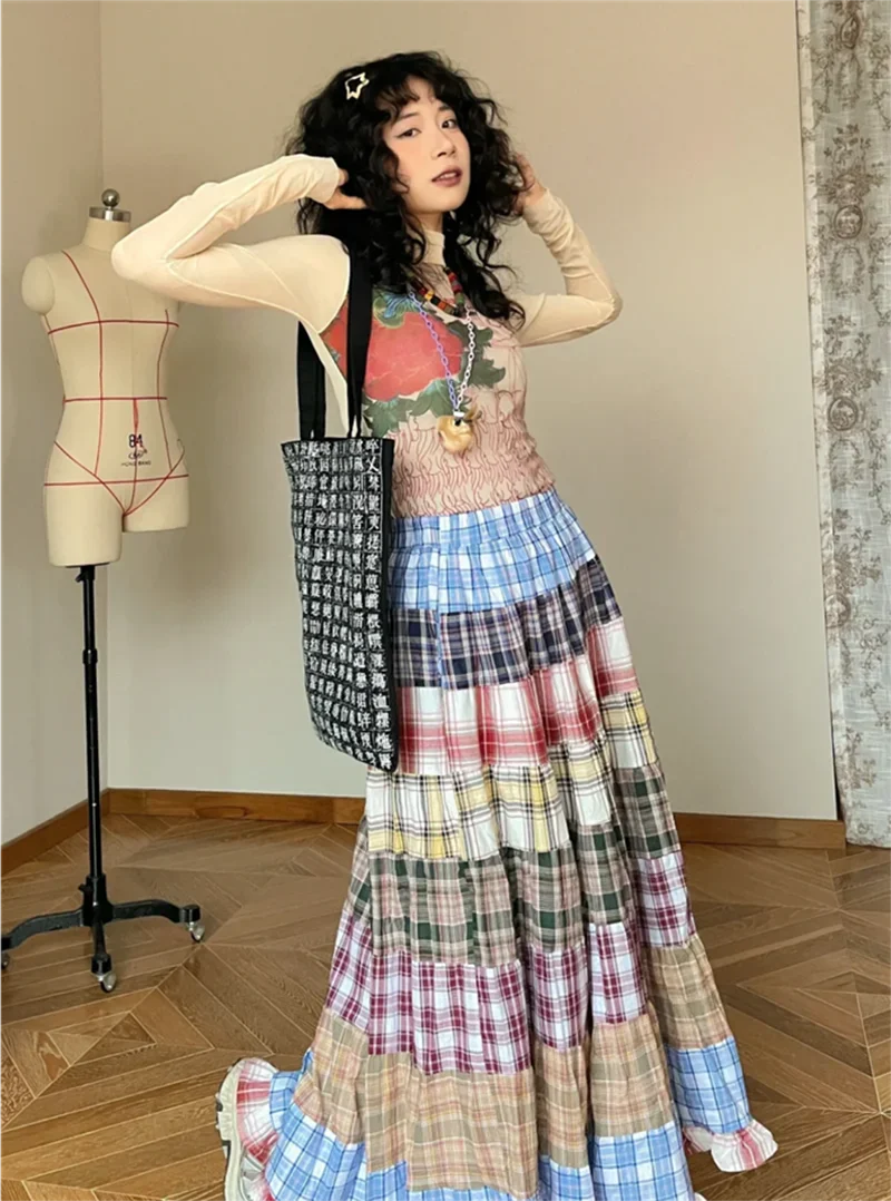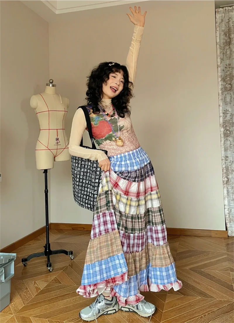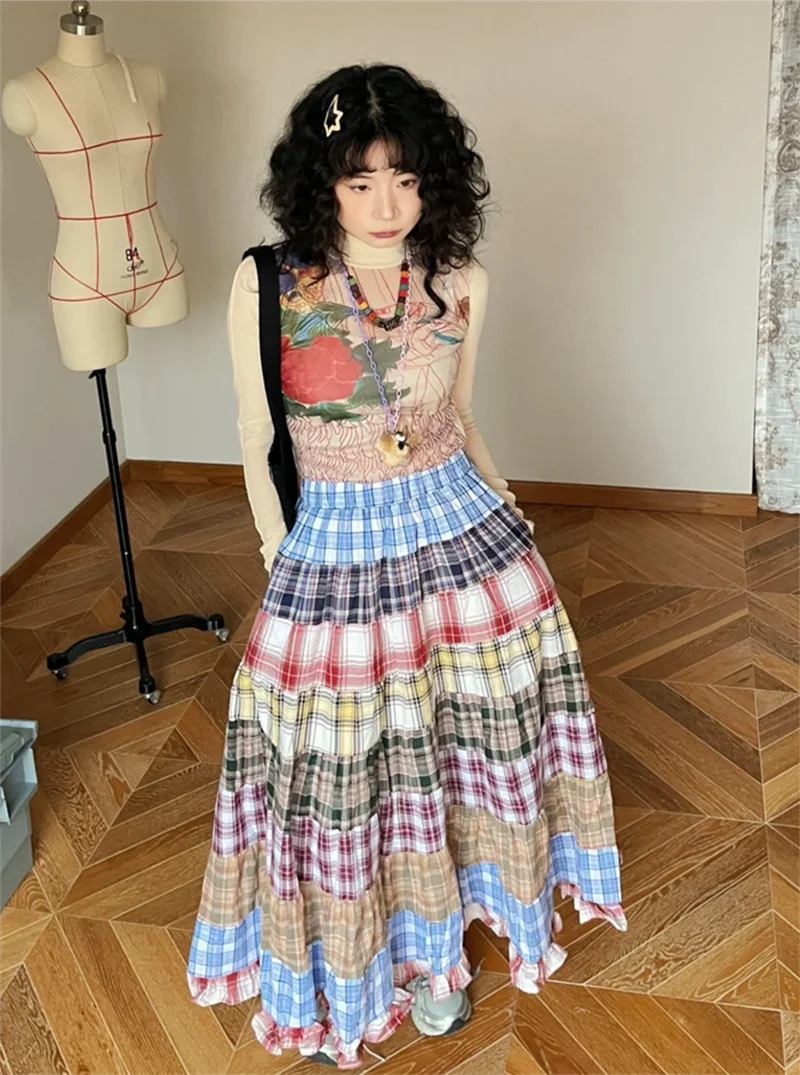 Embrace whimsical bohemian charm with our Plaid Patchwork Ruffles Maxi Skirt. a delightful addition for any adult wardrobe. This eye-catching skirt features a unique patchwork pattern that combines various textures and plaid elements. creating a visually rich and distinctive look. Playful ruffle decoration (implied by title. "None" in decoration spec could indicate subtle integration into fabric) adds a touch of whimsical flair. enhancing its flowing silhouette. Its elegant A-LINE silhouette gracefully extends to a mid-calf length. ensuring comfortable movement and a relaxed yet stylish presence.