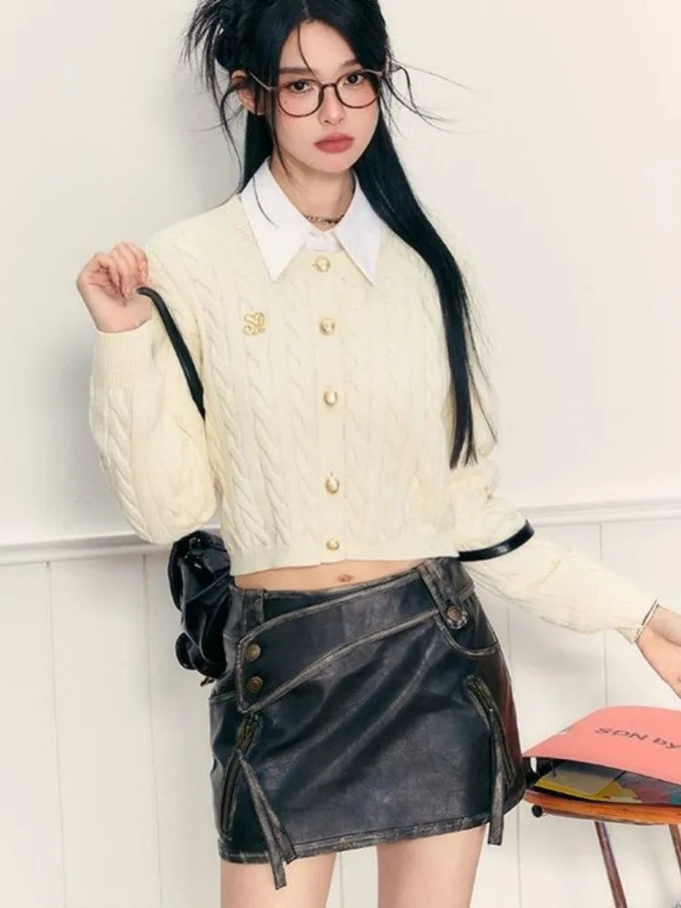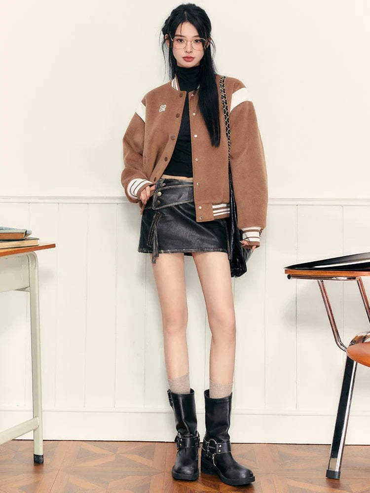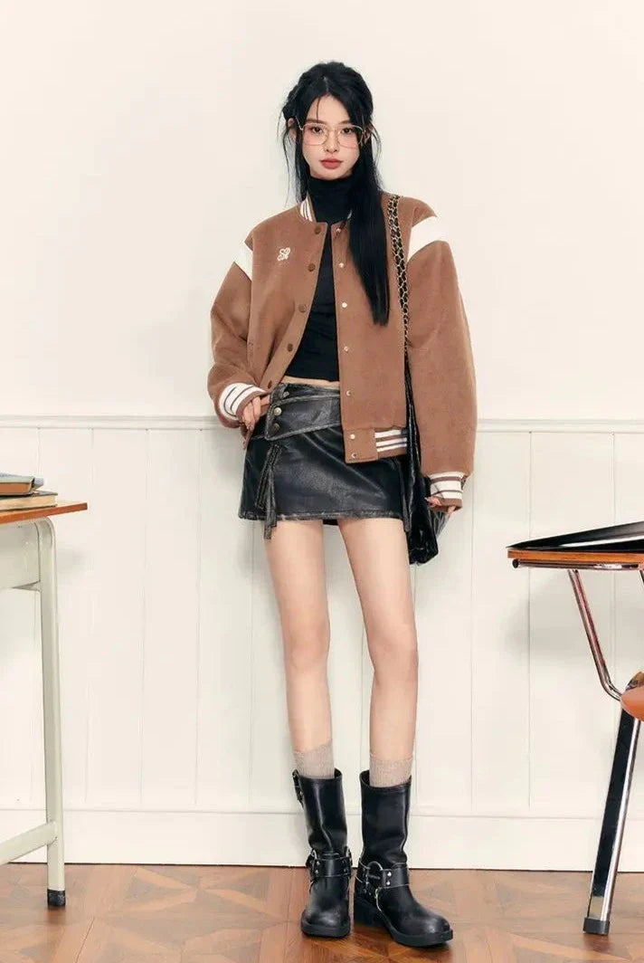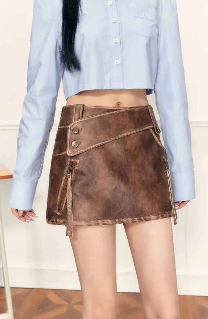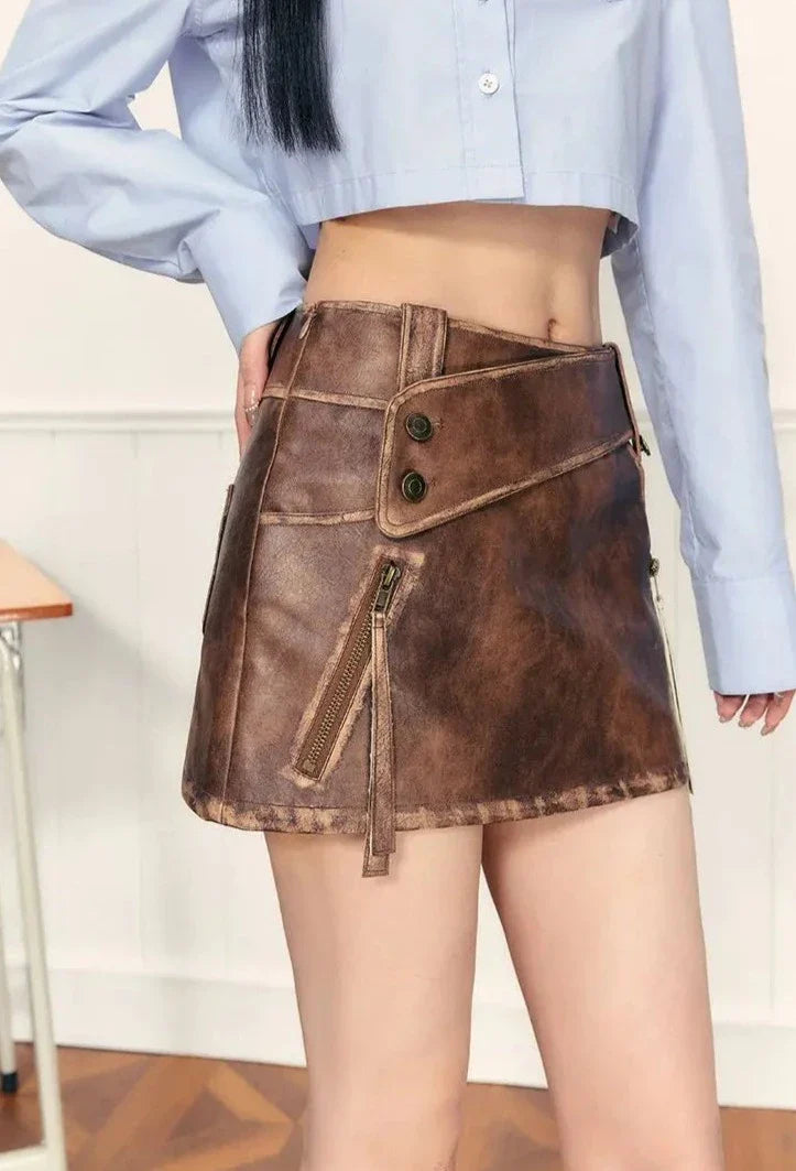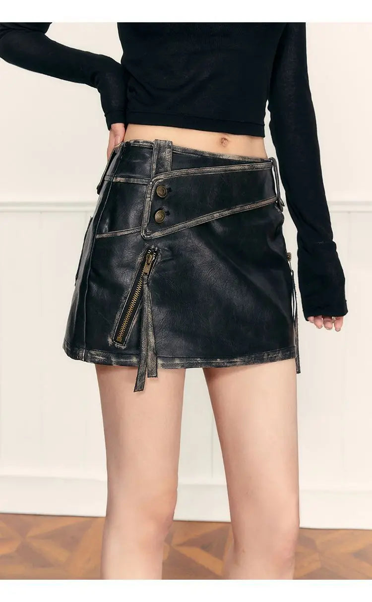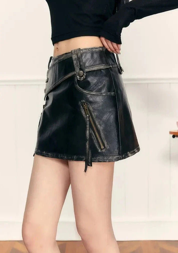 PU Leather High Waist A-Line Zipper Design Belted Mini Skirt