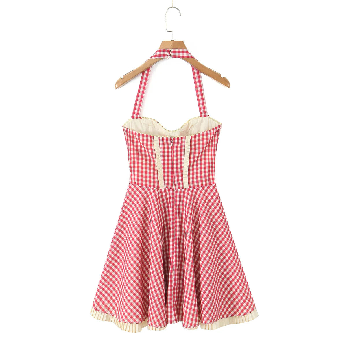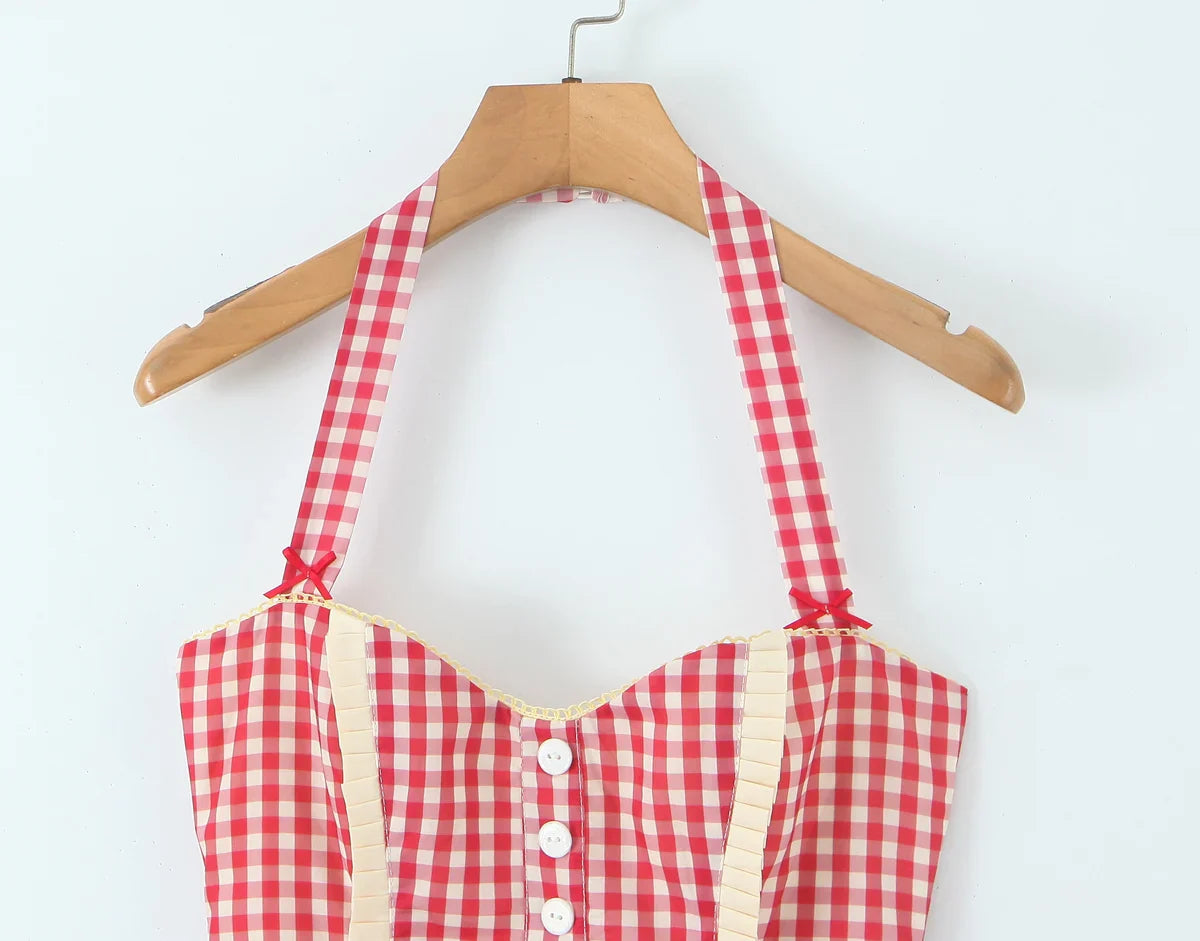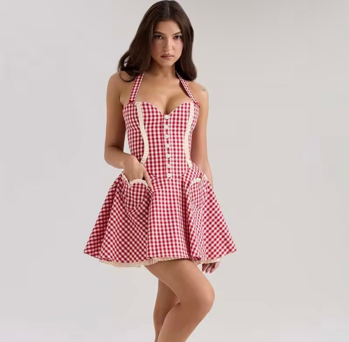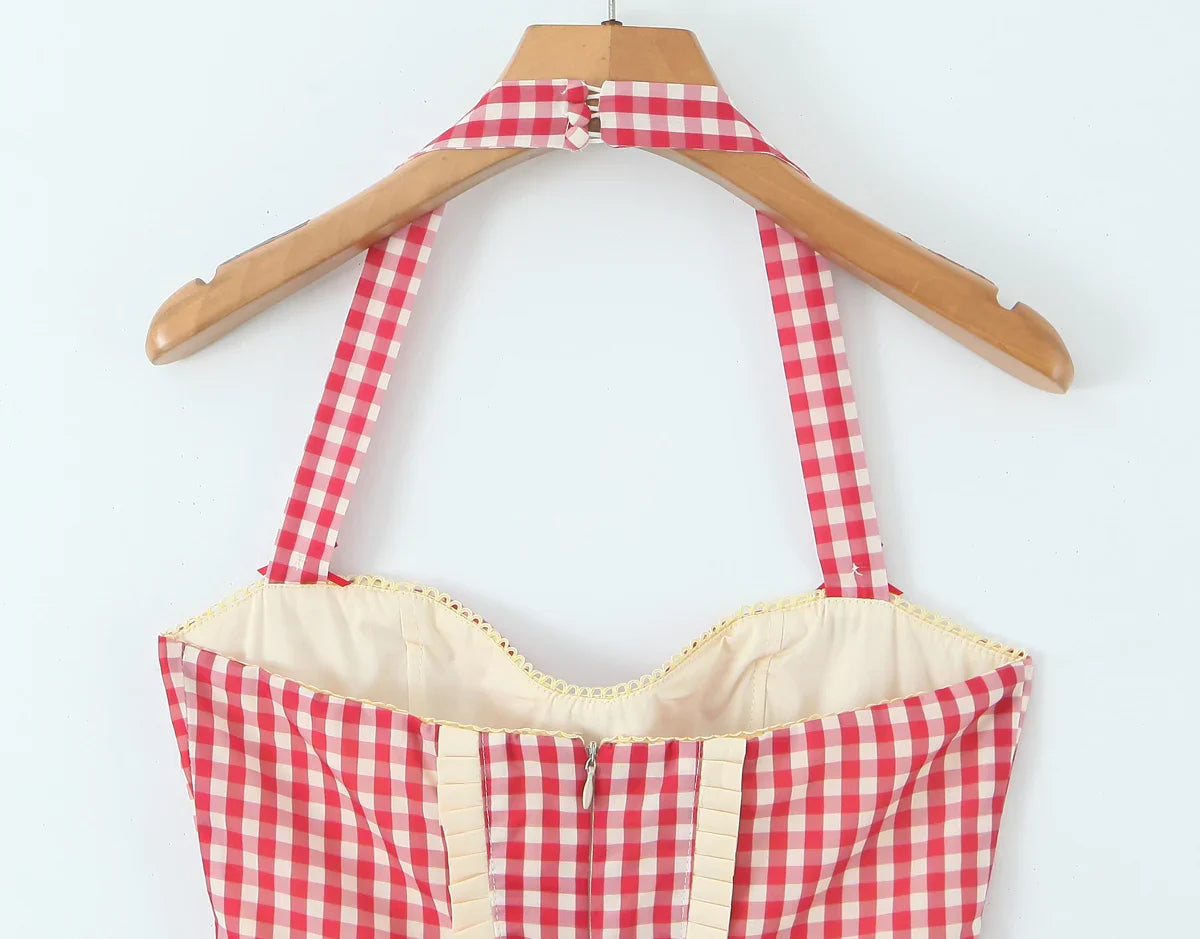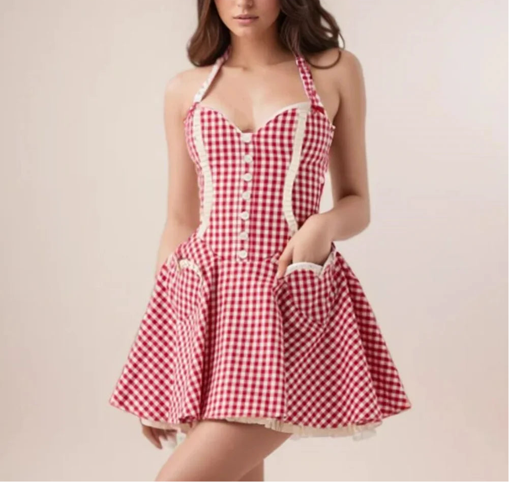 Red Plaid Print Heart Shaped Pocket Halter Mini Dress
