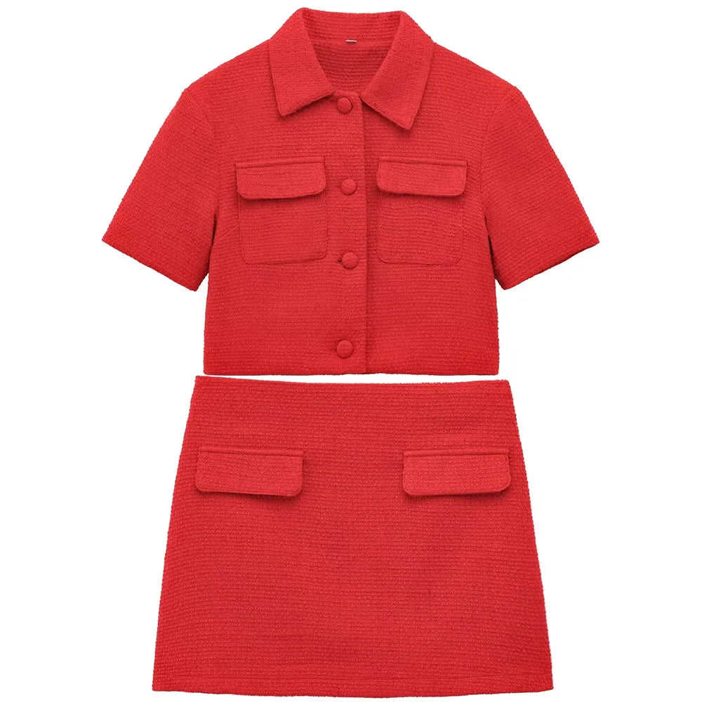 Red Solid Collar Short Sleeve Buttoned Top And Mini Skirt Set