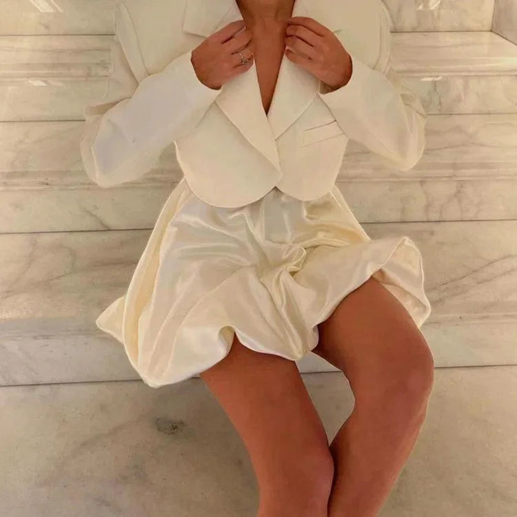 Who says you can't make a statement with a mini skirt? 🎈Bella Chix's Rory Balloon Flair Mini Skirt in crisp white satin will add flare and fun to any outfit. Perfect for parties or casual outings. 🎉