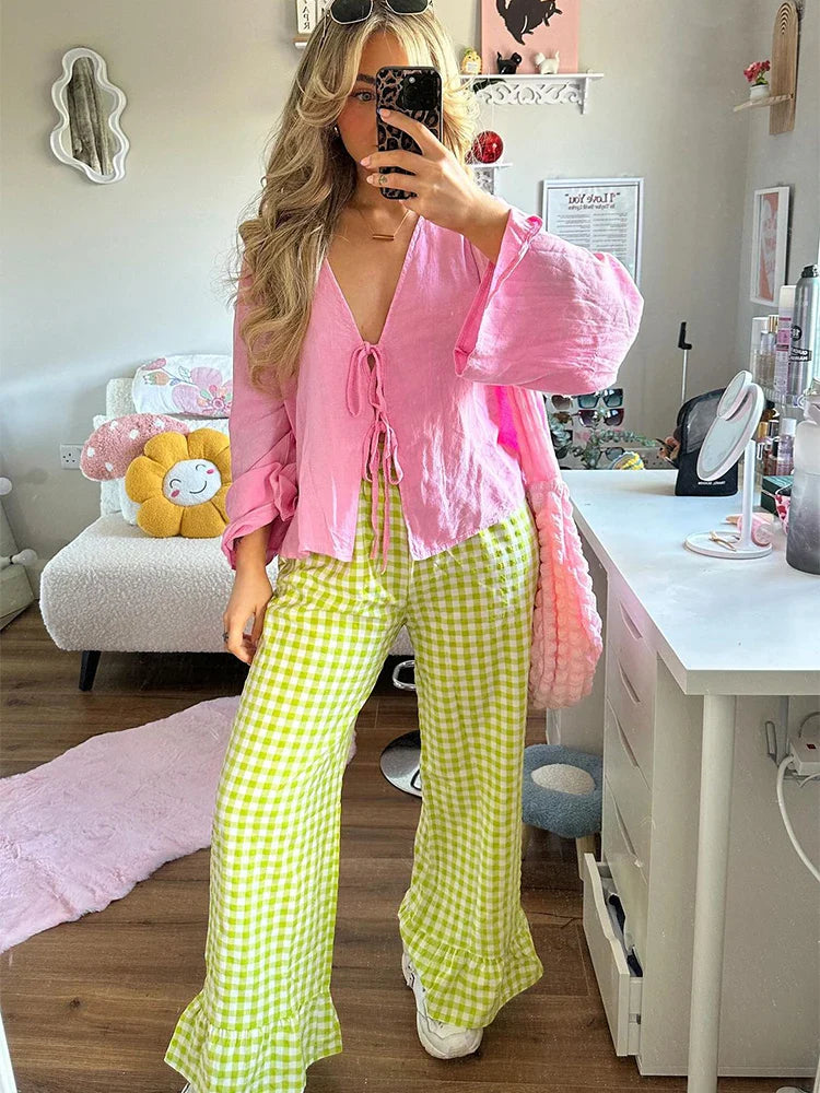 Embrace the breezy vibes in Bella Chix's Silent Serenade Blouse. With long sleeves and a lightweight cotton linen fabric. this blouse is perfect for a cool and casual look. The v-neck and hollow out design add a touch of uniqueness to the cool colors. Let your outfit sing with this playful top. (Note: no actual singing included!)