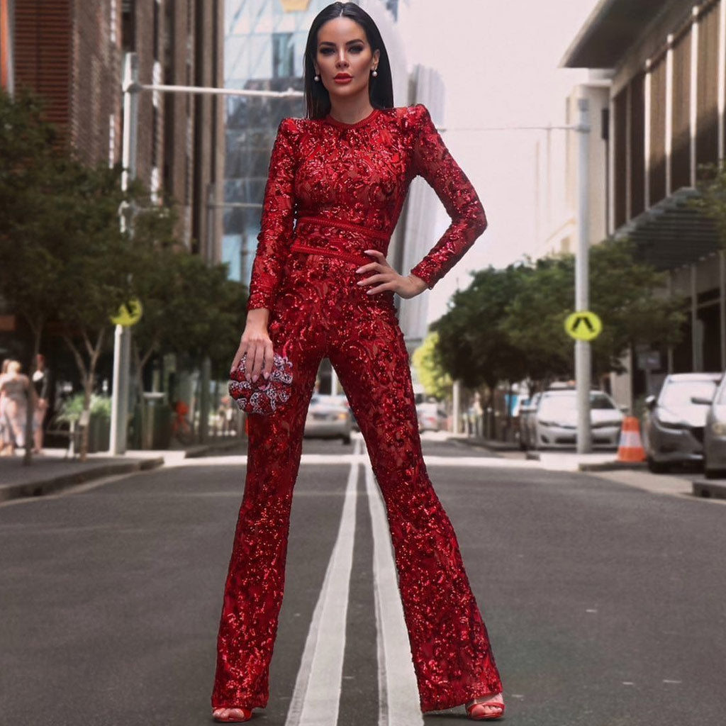 Sparkly sequin embellished with exquisite lace embroidery overlay. this luxury bandage catsuit is a staple to your partywear wardrobe. Having a body-flattering & flare figure with hidden back zip fastening. this gorgeous sequin jumpsuit also features a scoop neckline with scalloped leather edging. fitted long sleeves and fully lined. and the matching fitted bottom in a flare silhouette with wide cuffs. The statement corset belt cinched at waist with a self-tie closure at back. You look so charming in the luxurious lace jumpsuit. Complete a bold party look in cold weather with matching stilettos and a mini bag. Our designer clothes collection also contains the most irresistible designer sequin jumpsuits for women's partywear.