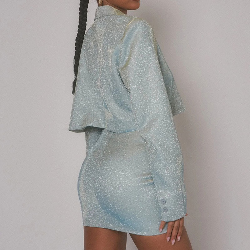 Left them wanting more looking like a diva in this shiny collared matching set. Crafted with polyester. stand out in a glittering effect throughout. featuring notched lapels along with a bottoned placket. long sleeves with button closures. a relaxed profile adorned with a faux welt pocket at the chest. ending with a cropped length. and complete a chic two piece autumn matching set with a fitted mini skirt structured with a concealed zipper to the rear. Find more trendy women's blazer matching sets or unique clothing in our boutique. and style it with a pair of high-heel boots for an eye-catching look.