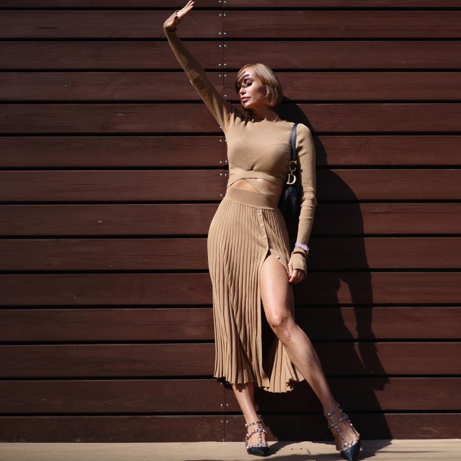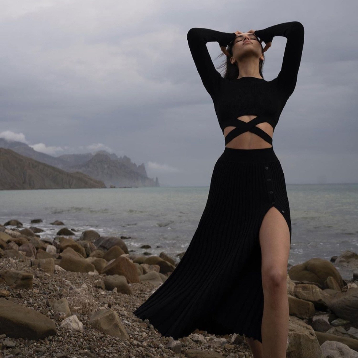 Verandah Pleated Long Skirt Set by Bella Chix has a cross-waisted crop top with long sleeves and a pleated Buttoned up long skirt.