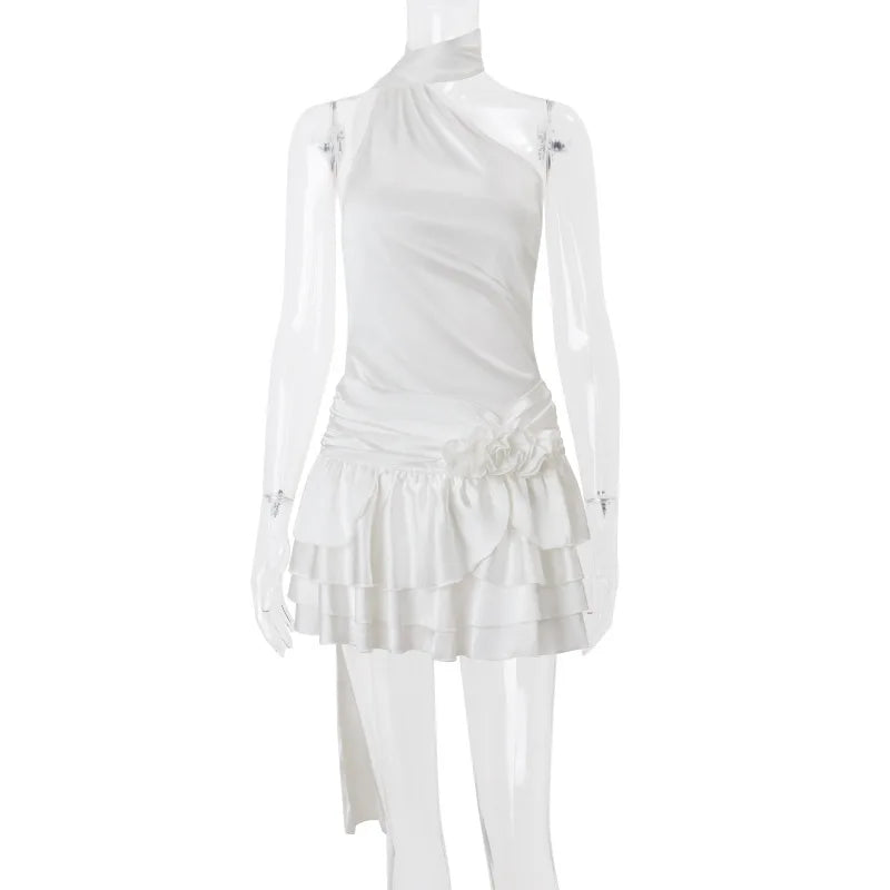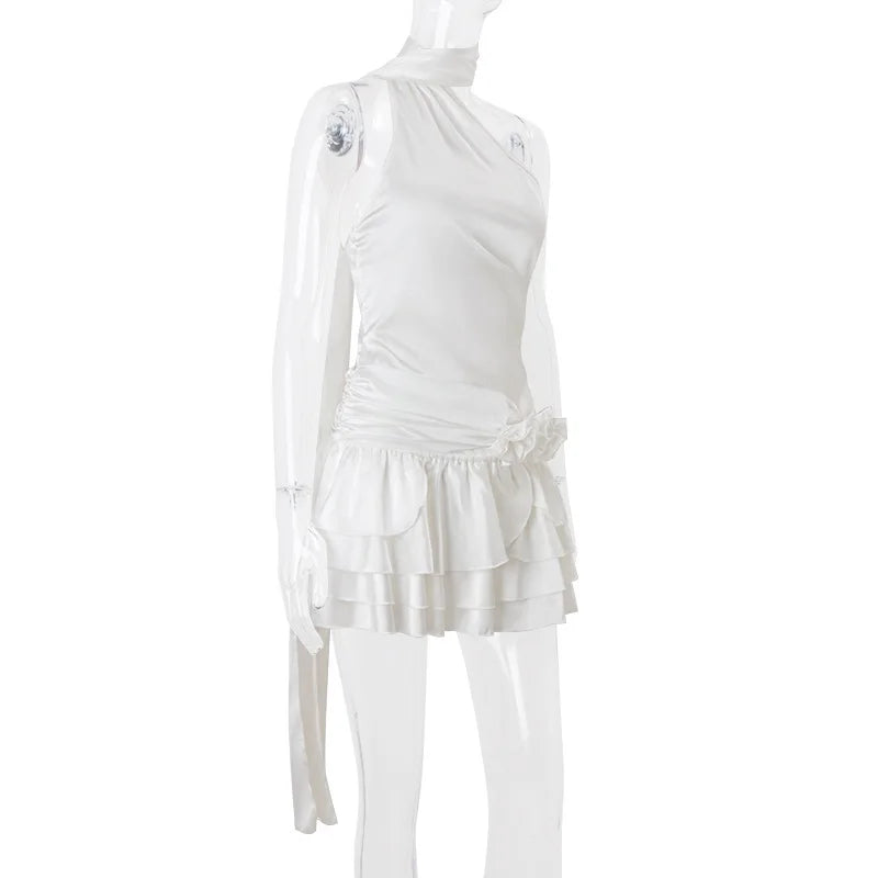 White Satin Halter Frill Flower Drape Mini Dress