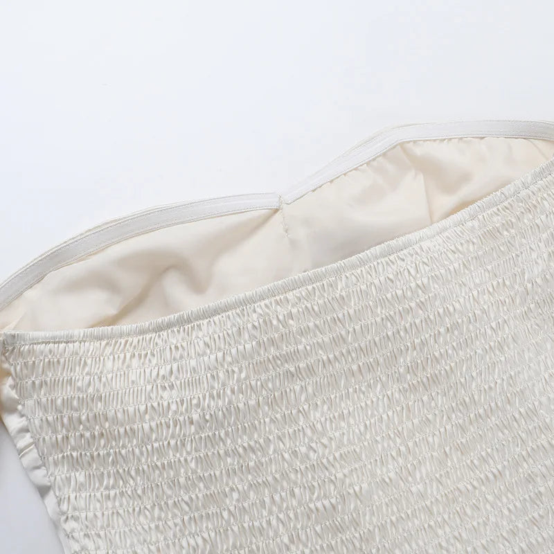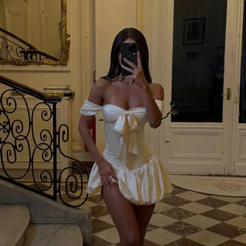 White Satin Off Shoulder Elastic Puff Mini Dress