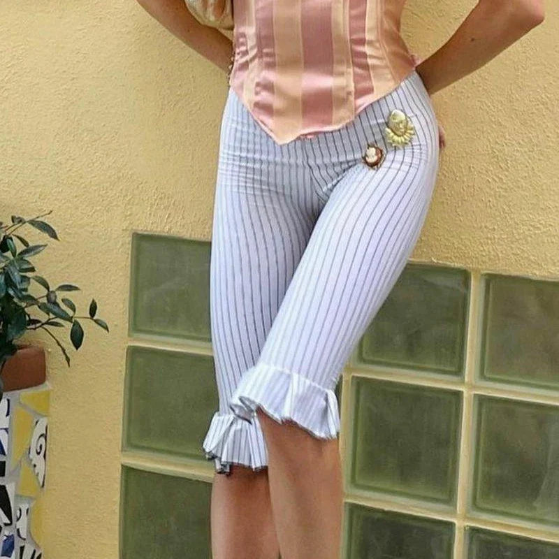 White Stripe Capri Ruffles Hem High Waist Pants